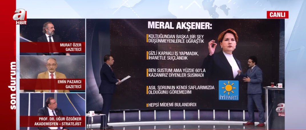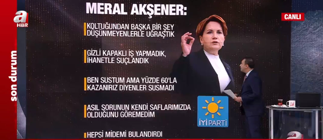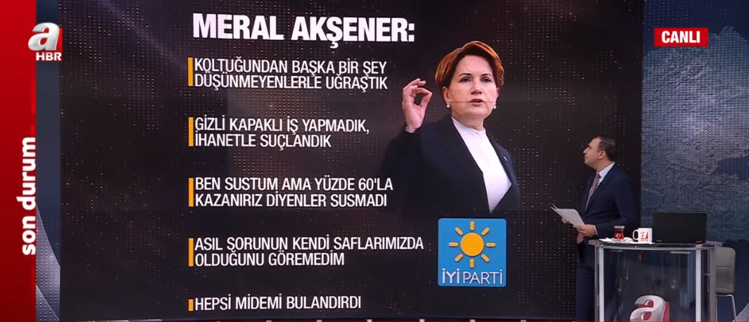 Gazeteci Gaffar Okanca: Biz bir laf var ata binmek bir ayıp inmek iki ayıp derler. Meral Hanım madem nedamet getirecekti bu yaptığı şeylerle ilgili o zaman o ata niye bindiniz? Ben bu ittifak atından inmek istiyorum diyor bu at bizi başarısızlığa sürükledi diyor. Gidin şu köşede bir yerde inin attan niye böyle meydanda iniyorsunuz? Bağıra bağır iniyorsunuz? Demek ki İYİ Parti'nin bir sıkışmışlığı var.