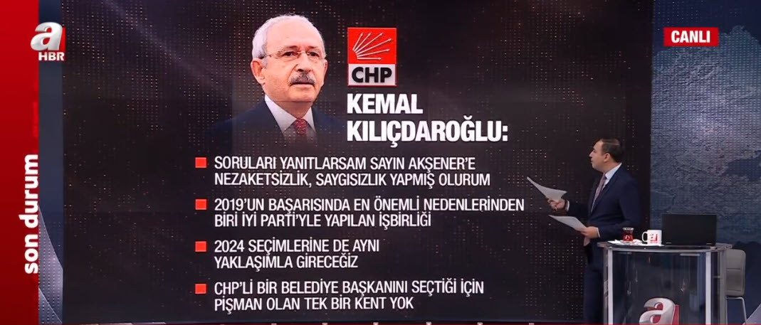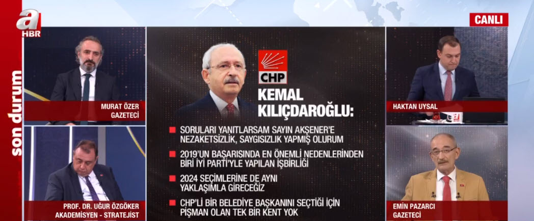 Muhalefetteki çatlak yerel seçim öncesi derinleşiyor mu?Kılıçdaroğlu'nun "Konuşursam Akşener'e nezaketsizlik olur" lafı ne anlama geliyor? Gazeteci Gaffar Okanca, Akşam Gazetesi Ankara Temsilcisi Emin Pazarcı ve kademisyen – Stratejist Prof. Dr. Uğur Özgöker, A Haber canlı yayınında gündemin öne çıkan başlıklarıyla ilgili çarpıcı değerlendirmelerde bulundu.