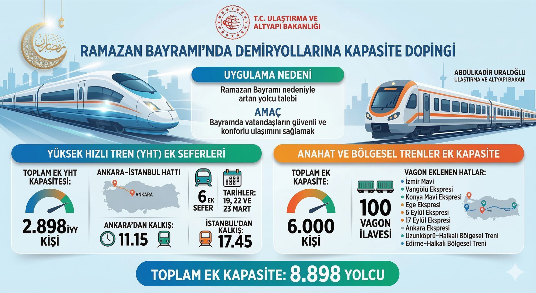 Ulaştırma ve Altyapı Bakanı Abdulkadir Uraloğlu, Ramazan Bayramı döneminde artan yolcu talebine karşı demiryolu ulaşımında kapasitenin artırıldığını duyurdu. Yapılan planlamayla yüksek hızlı tren, anahat ve bölgesel tren hatlarında toplam 8 bin 898 kişilik ek kapasite oluşturulacak.