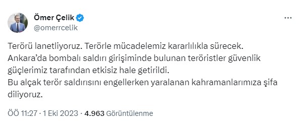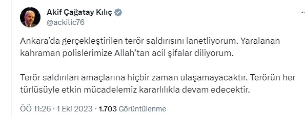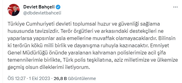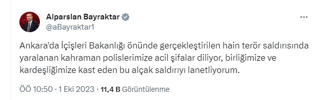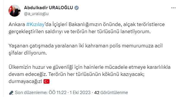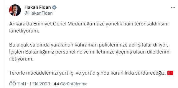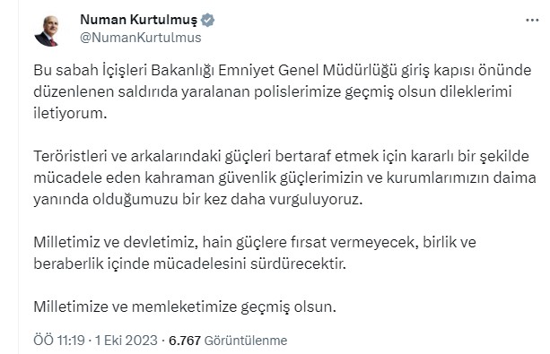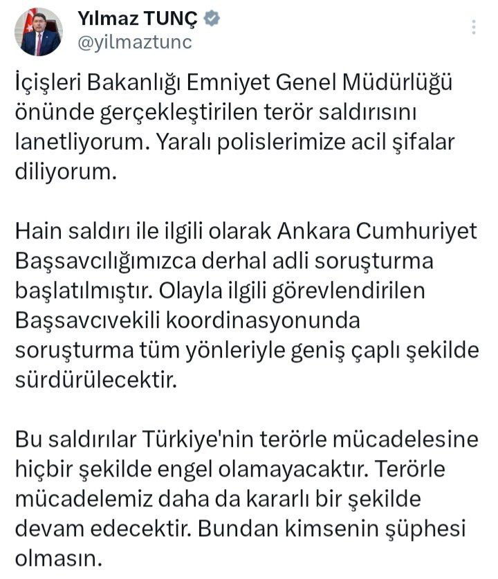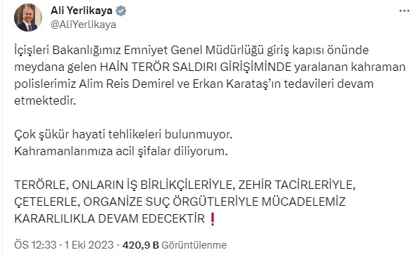 "İçişleri Bakanlığımız Emniyet Genel Müdürlüğü giriş kapısı önünde meydana gelen hain terör saldırı girişiminde yaralanan kahraman polislerimiz Alim Reis Demirel ve Erkan Karataş'ın tedavileri devam etmektedir. Çok şükür hayati tehlikeleri bulunmuyor. Kahramanlarımıza acil şifalar diliyorum.