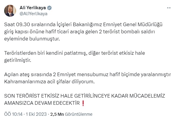 "Saat 09.30 sıralarında İçişleri Bakanlığımız Emniyet Genel Müdürlüğü giriş kapısı önüne hafif ticari araçla gelen 2 terörist bombalı saldırı eyleminde bulunmuştur. Teröristlerden biri kendini patlatmış, diğer terörist etkisiz hale getirilmiştir.