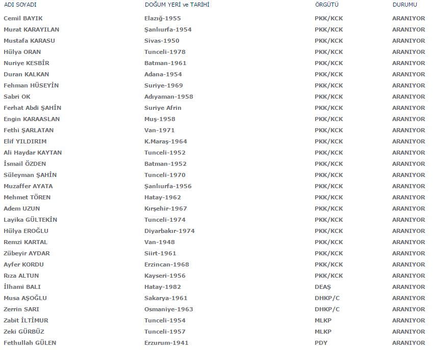 KIRMIZI LİSTE İçişleri Bakanlığı, aranan terörist listesini güncelledi. Listede 14 ayrı terör örgütünden toplam 781 kişi Türkiye'de aranıyor. Fetullah Gülen ve Murat Karayılan gibi terör örgütü liderlerinin de aralarında bulunduğu 781 teröristin başına konulan ödül miktarı ise toplam 534 milyon Türk Lirası.