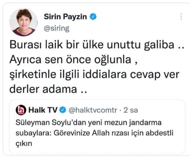 İçişleri Bakanı Süleyman Soylu, Jandarma ve Sahil Güvenlik Akademisi Başkanlığı Subay ve Astsubay Öğrencileri Mezuniyet Töreni'nde yaptığı açıklamada, göreve çıkarken abdestli olmalarını istedi. Halk TV sunucusu Şirin Payzın, Bakan'ın 'abdest alın' sözünden rahatsız olup 'laiklik' şovuna girişti. Soylu'yu hedef alan açıklamalara vatandaşlar, Payzın'ın teröristlerle çektirdiği fotoğrafları paylaşarak sert yanıt verdi.