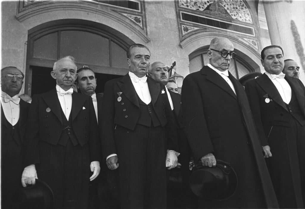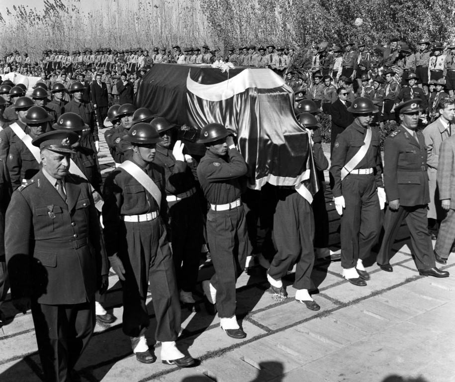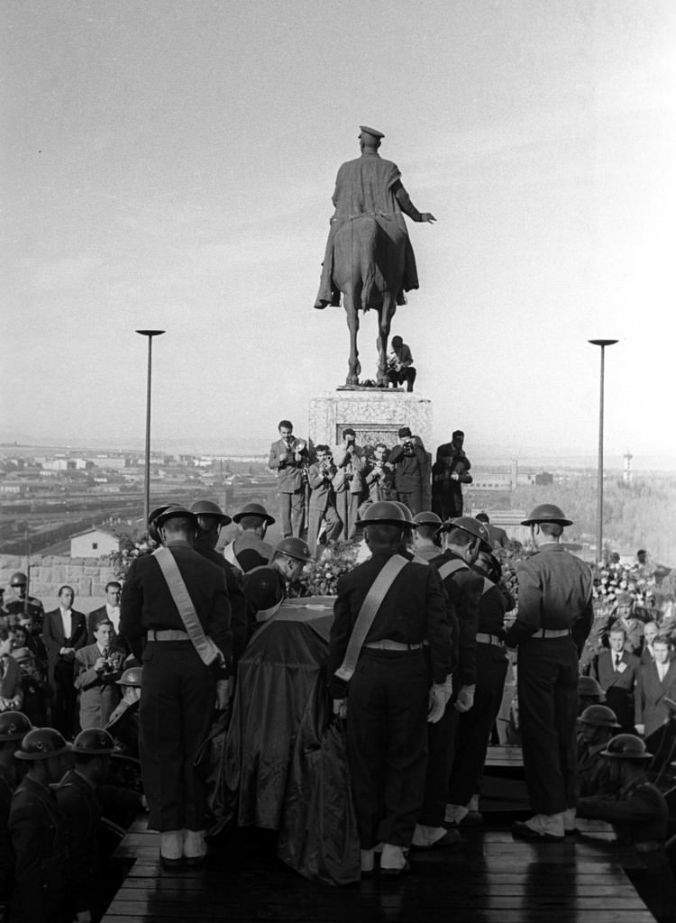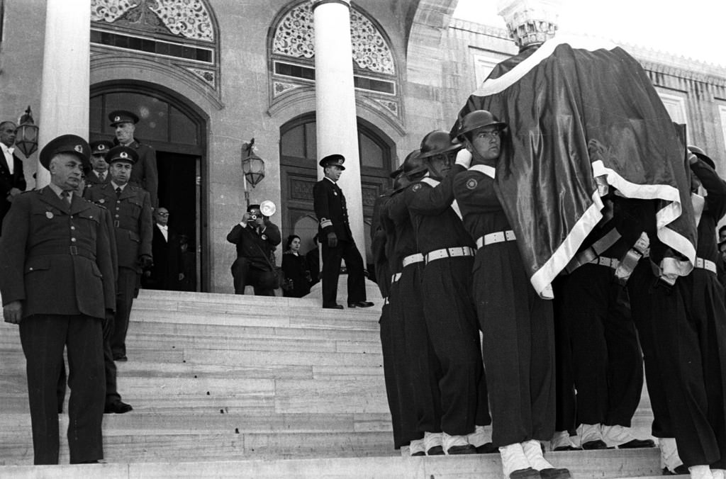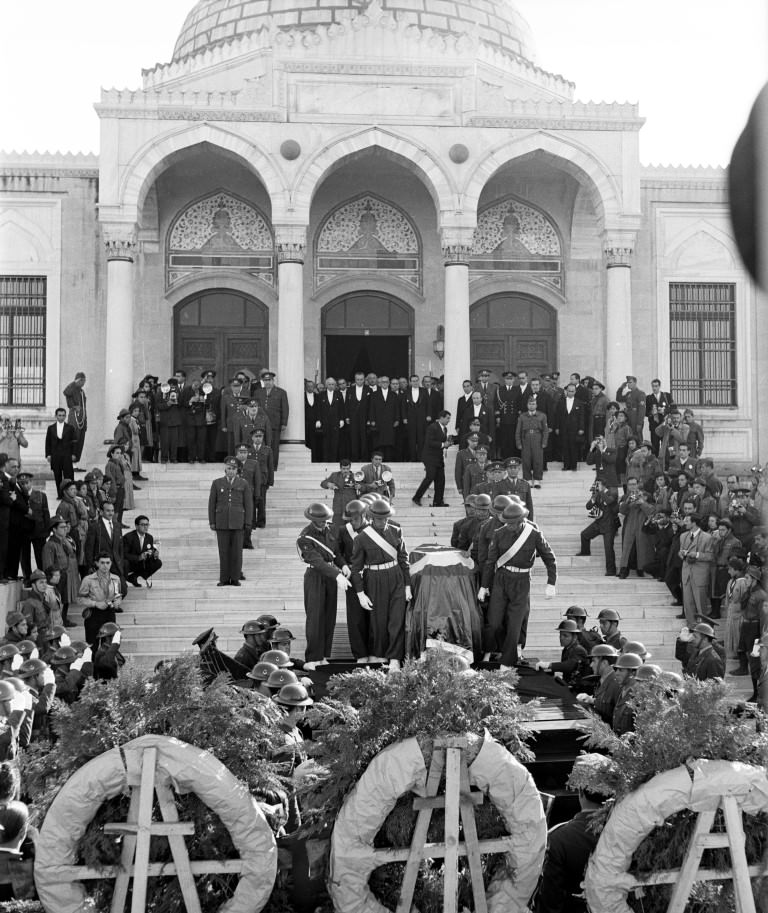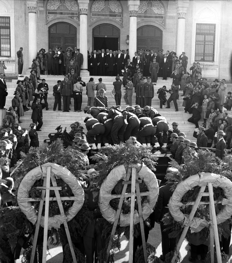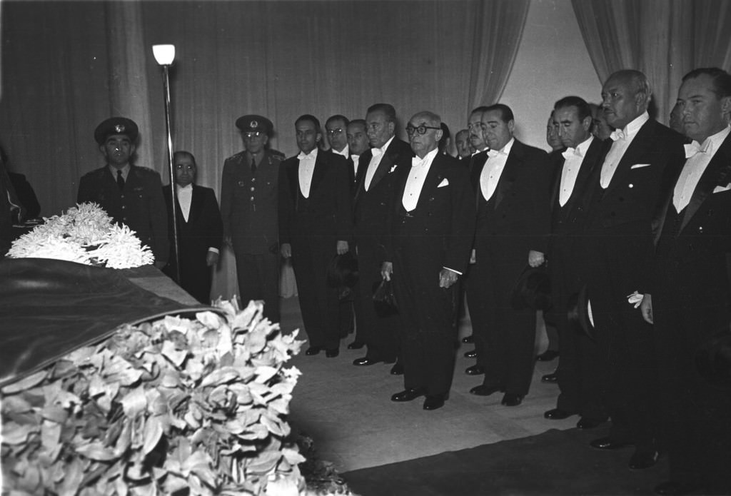 Atatürk'ün naaşı, Anıtkabir'e defnedilmek üzere Etnografya Müzesi'nden çıkarılmadan önce Cumhurbaşkanı Celal Bayar (sağ 3), Meclis Başkanı Refik Koraltan (sol 2), (arka sıra sağdan sola) Adalet Bakanı Osman Şevki Çiçekdağ, Bayındırlık Bakanı Kemal Zeytinoğlu, Başbakan Adnan Menderes ve İşletmeler Bakanı Sırrı Yılcalı saygı duruşunda görülüyor.