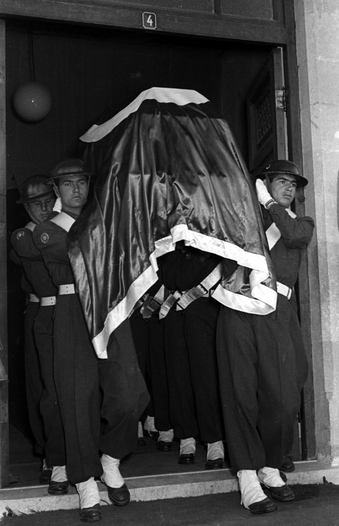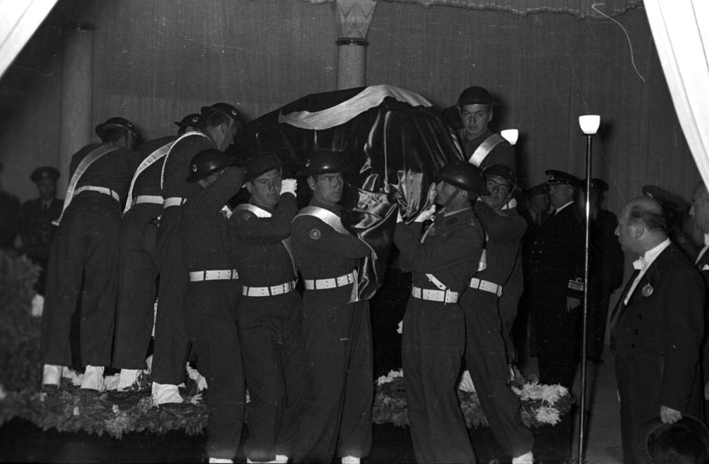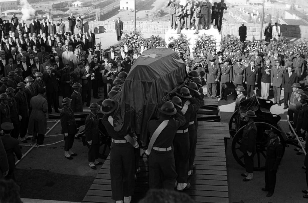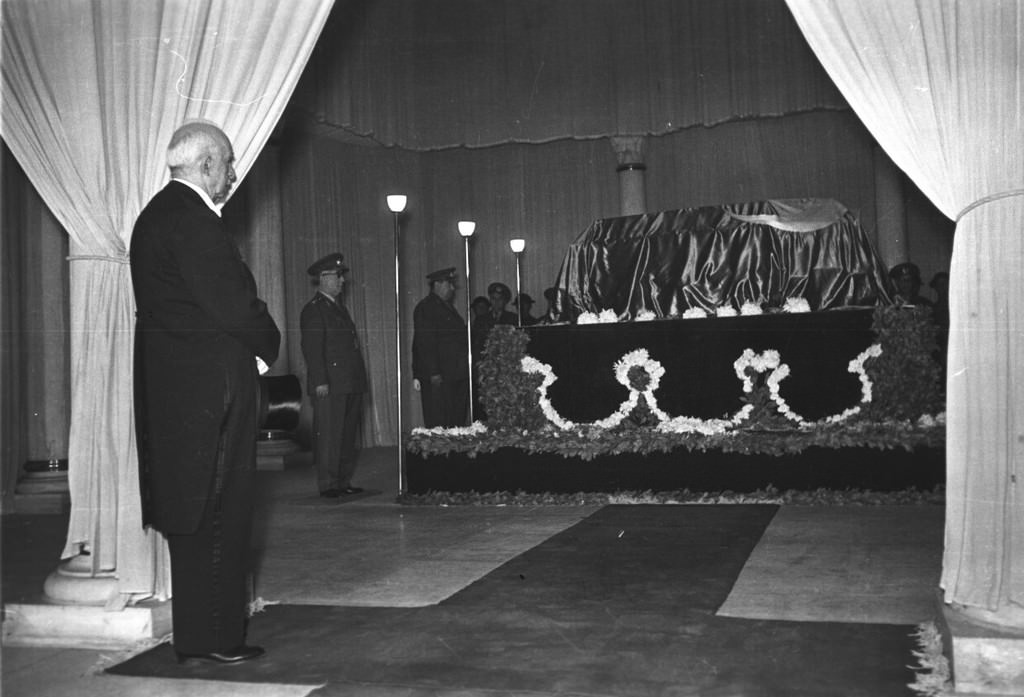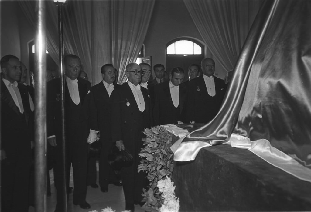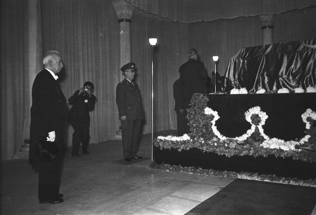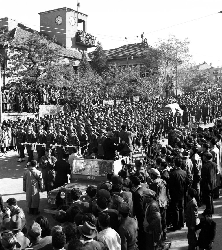 Atatürk'ün naaşı, Anıtkabir'e defnedilmek üzere Etnografya Müzesi'nden çıkarılmadan önce Cumhurbaşkanı Celal Bayar (sağ 3), Meclis Başkanı Refik Koraltan (sol 2), (arka sıra sağdan sola) Adalet Bakanı Osman Şevki Çiçekdağ, Bayındırlık Bakanı Kemal Zeytinoğlu, Başbakan Adnan Menderes ve İşletmeler Bakanı Sırrı Yılcalı saygı duruşunda görülüyor.