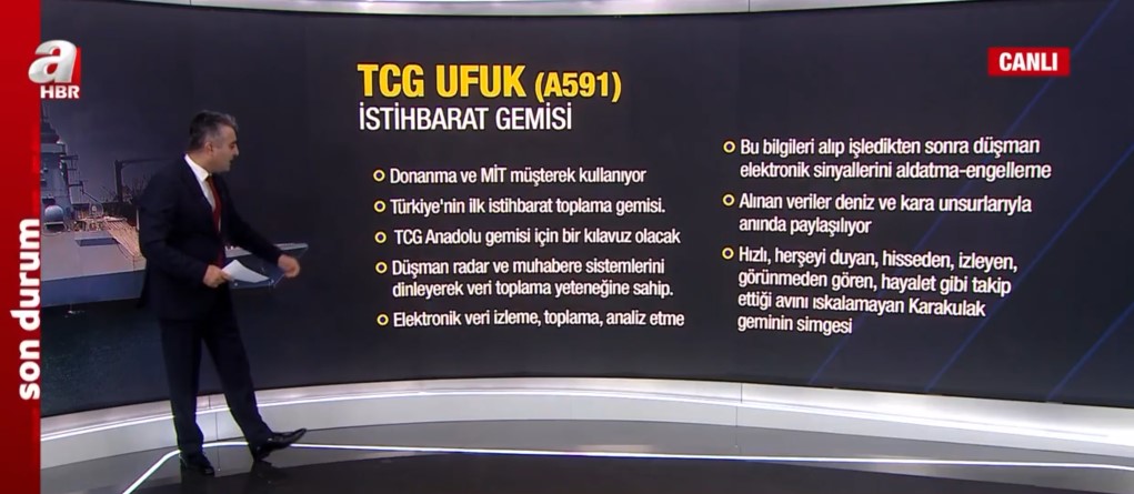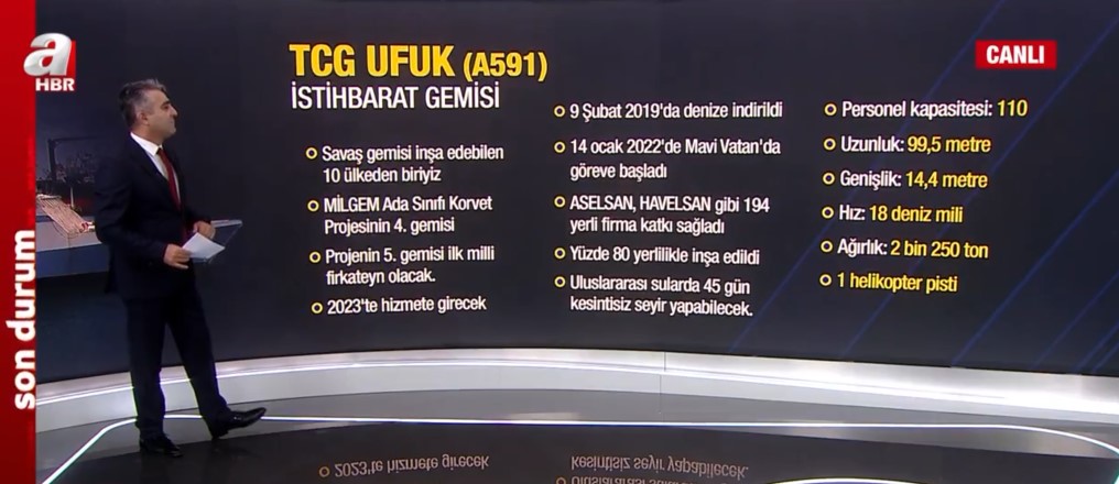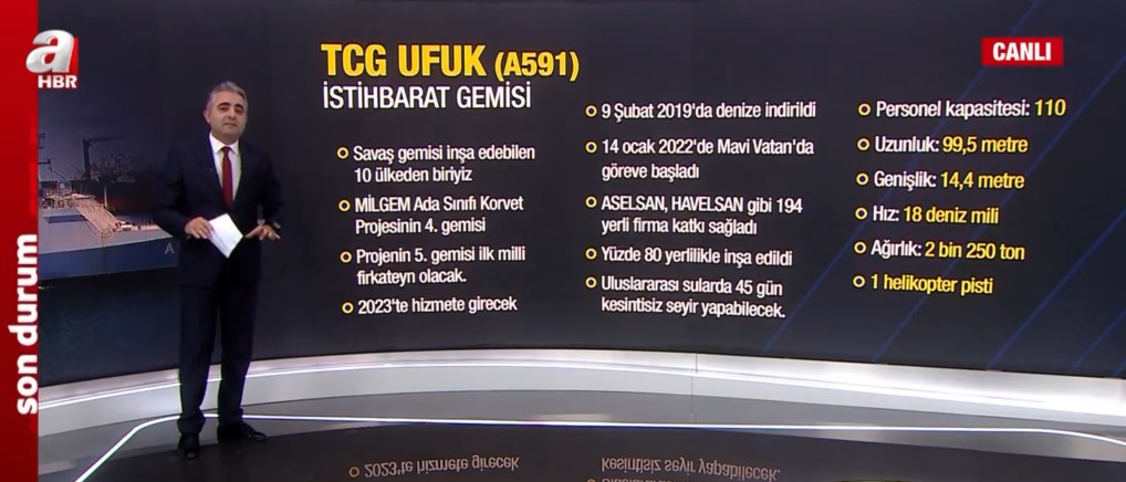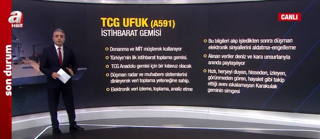Yunan medyası bir kez daha Türkiye'nin yerli ve milli imkanlarla ürettiği araçları gündemine taşıdı. İstihbarat gemisi TCG Ufuk gemisinin, Yunan ve Fransız donanmalarının ortak tatbikatını izlediği iddia edilen haberde, radar sisteminin başarılı olduğuna dikkat çekildi. Atina'yı telaşlandıran Türk istihbarat gemisi TCG Ufuk gemisinin özellikleri neler? TCG Ufuk hangi donanıma sahip? Türk istihbarat gemisi Yunanistan-Fransa tatbikatını mı izledi? Gelişmeleri İstanbul/Yurt Haberler Müdürü Kerim Ulak anlattı.