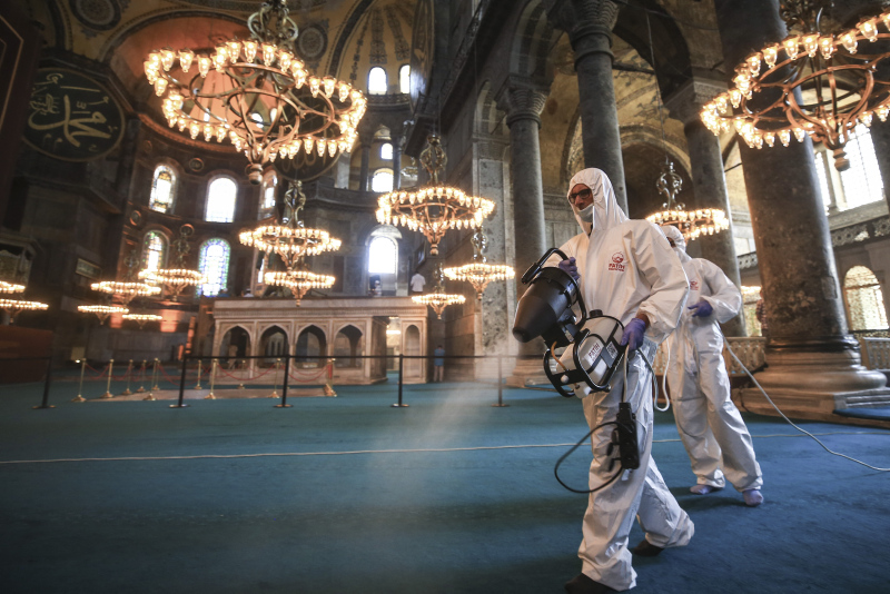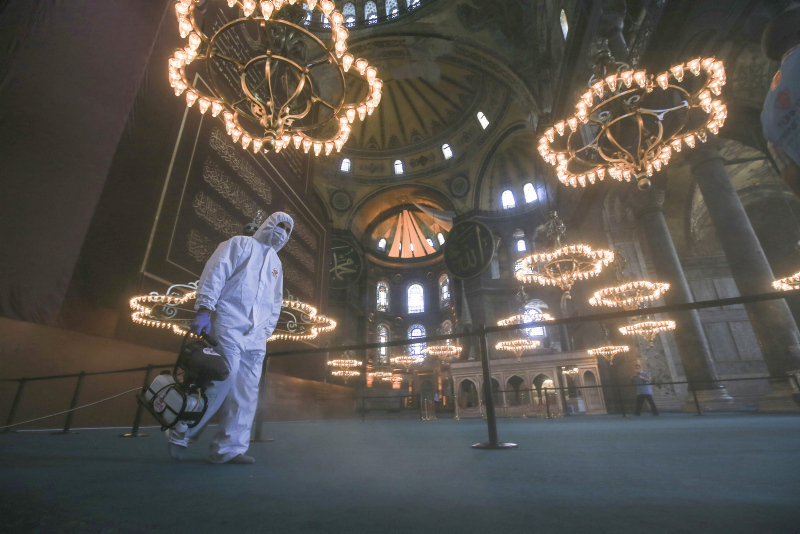 Ayasofya-i Kebir Cami-i Şerifi ve çevresinde, Fatih Belediyesi tarafından Kurban Bayramı arifesi dolayısıyla temizlik ve dezenfeksiyon çalışması yapıldı. Ayasofya-i Kebir Camii ile Sultanahmet Camii arasındaki alan da özel solüsyonlu sularla yıkanıp dezenfekte edilerek, yarın eda edilecek bayram namazına hazırlandı.