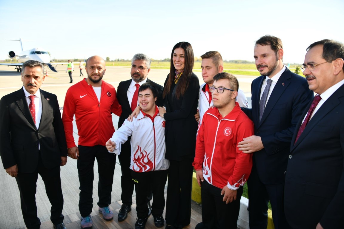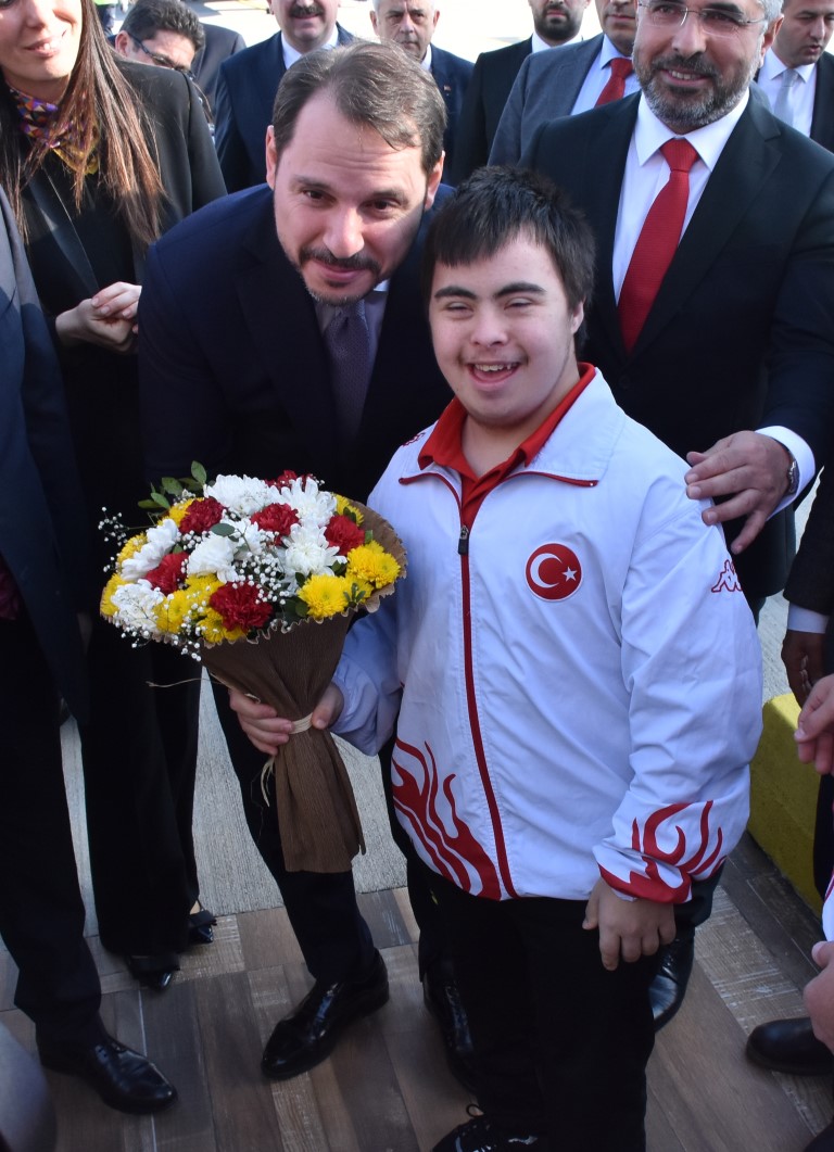 Down sendromlu çocukların da katıldığı karşılamada bir çocuk tarafından Bakan Albayrak'a çiçek takdim edildi.