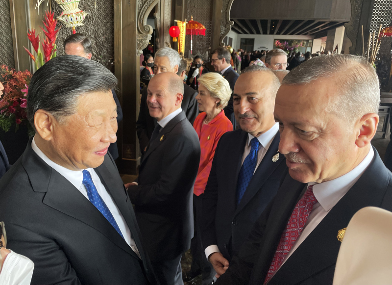 Bali'deki Apurva Kempinski'de yapılan G20 Liderler Zirvesi'nin birinci oturumu öncesinde Erdoğan, liderlerle ayaküstü görüştü.