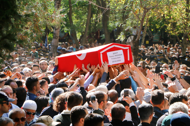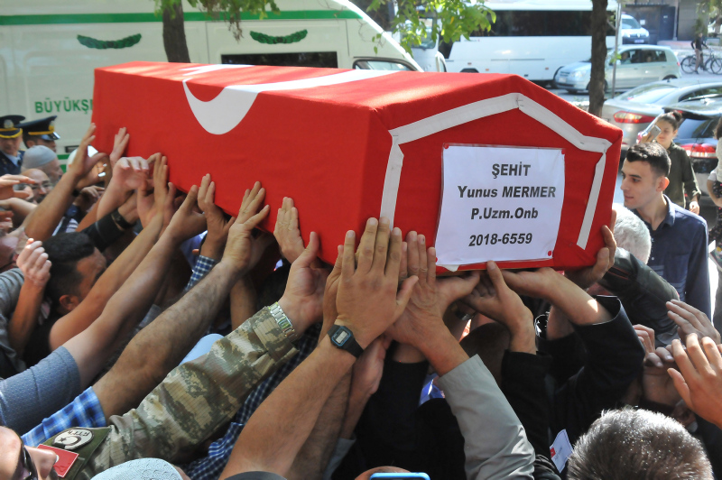 Barış Pınarı Harekatı'nı yürüten TSK unsurlarına Suriye'nin Tel Rıfat bölgesinde PKK/PYD terör örgütü tarafından düzenlenen havan saldırısında şehit olan Piyade Uzman Onbaşı Yunus Mermer'in (24) naaşı Musalla Mezarlığındaki Namazgah'a getirildi.