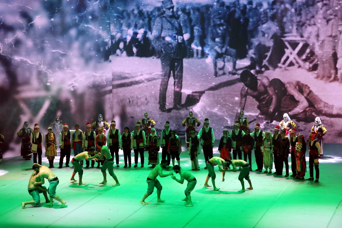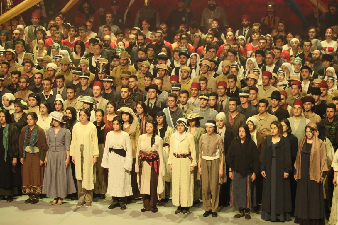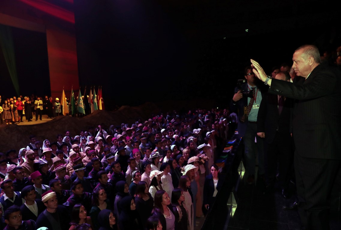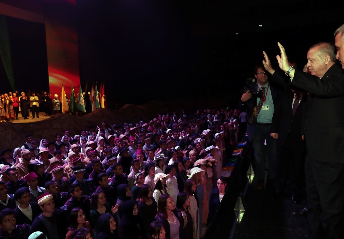Burada "1919 Bitmeyen Yolculuk" drama sahne gösterimini izleyen Erdoğan, oyuncular ve programda emeği geçenleri, selamlama sırasında beraberindekilerle ayakta alkışladı.