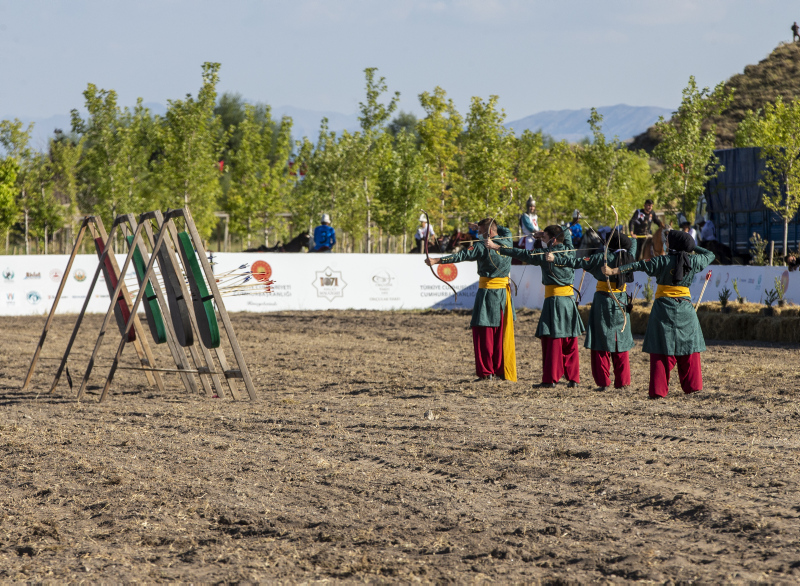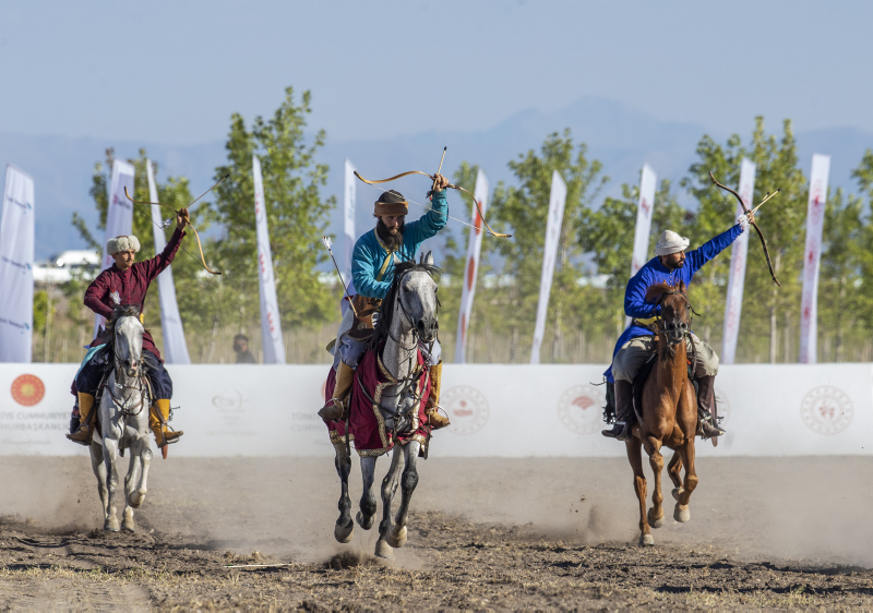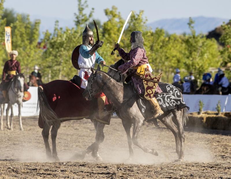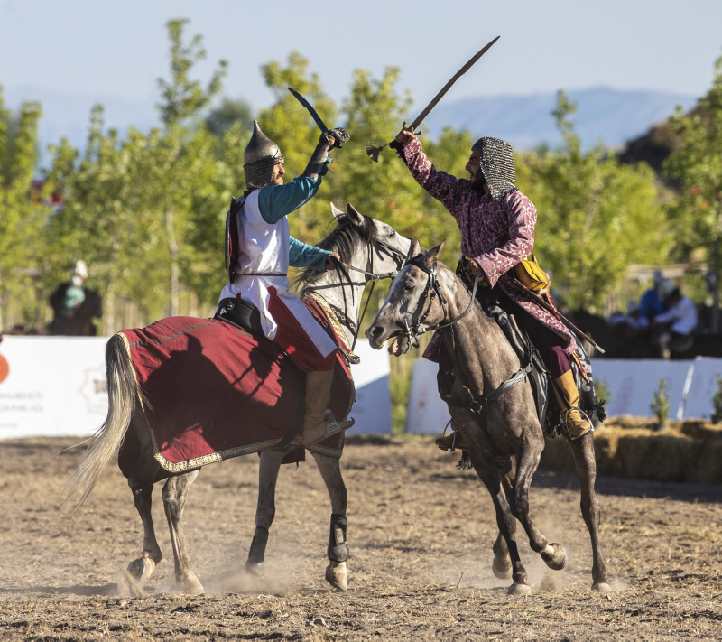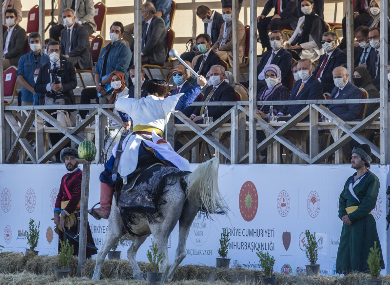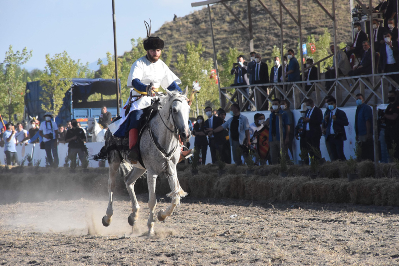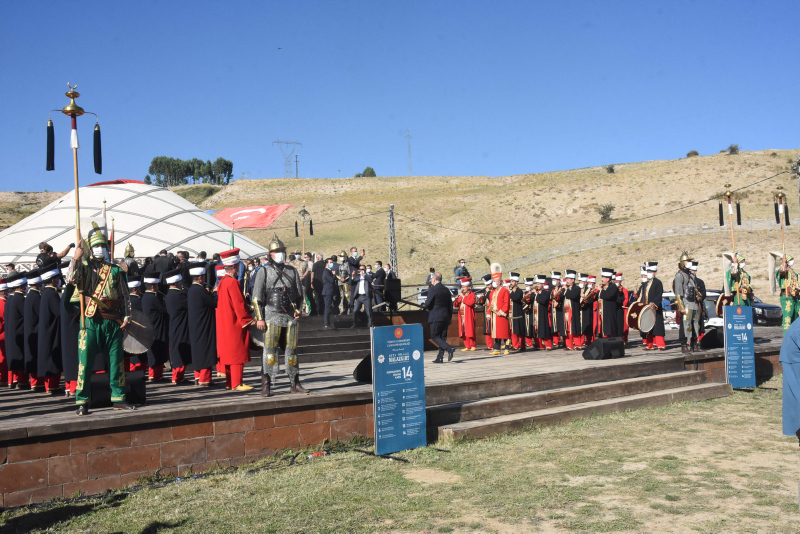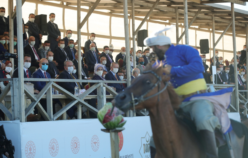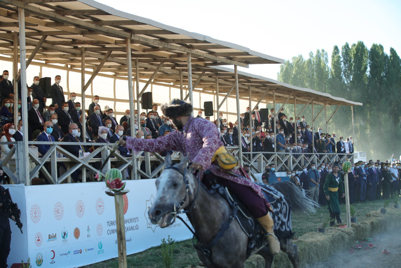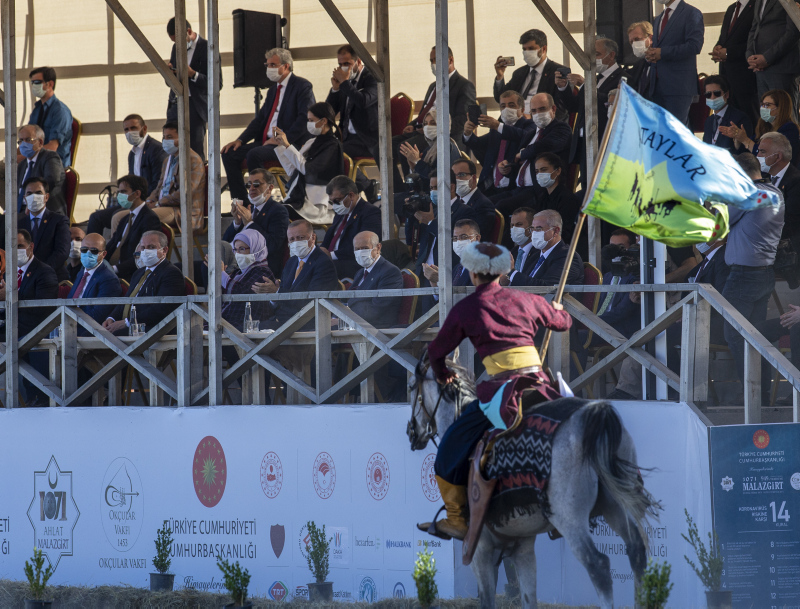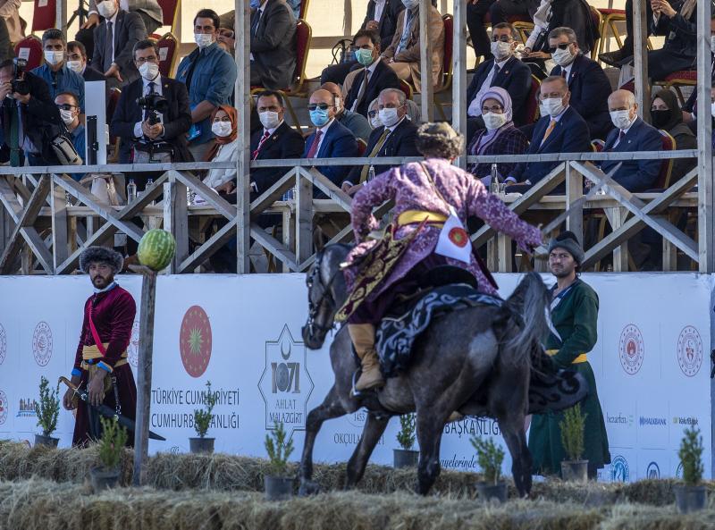 Cumhurbaşkanı Recep Tayyip Erdoğan, MHP Genel Başkanı Devlet Bahçeli ile birlikte Ahlat'taki etkinlik alanında düzenlenen Malazgirt Zaferi'ni canlandırma etkinliğiyle okçuluk, kökbörü ve atalı okçuluk gösterilerini izledi.