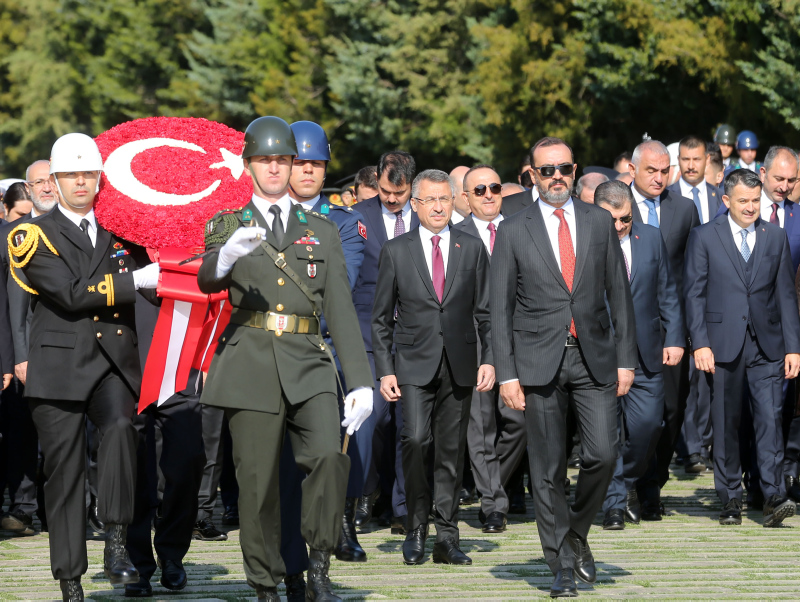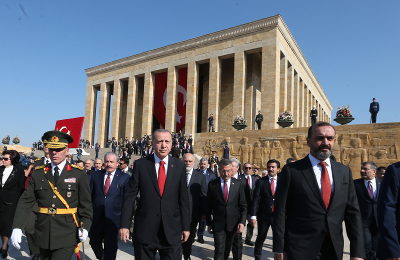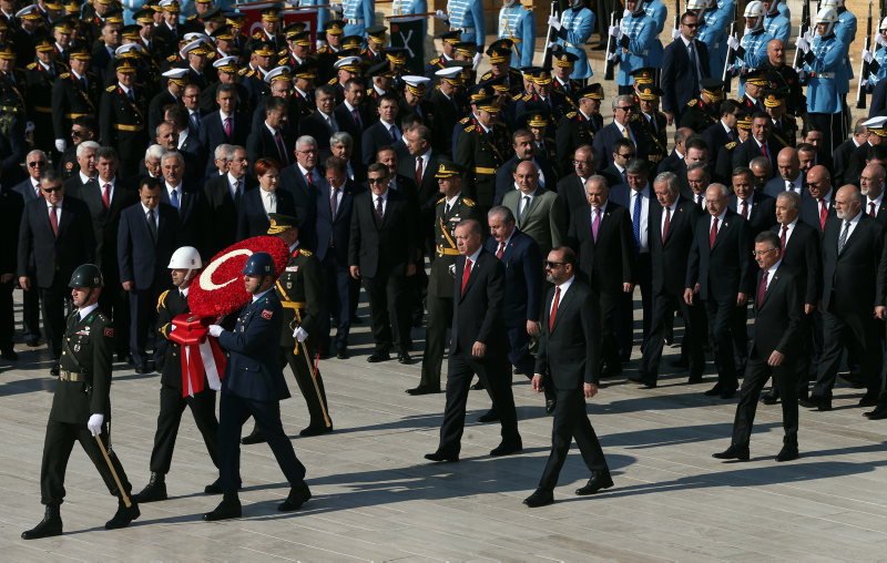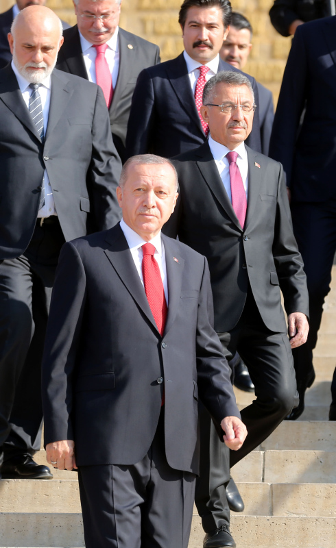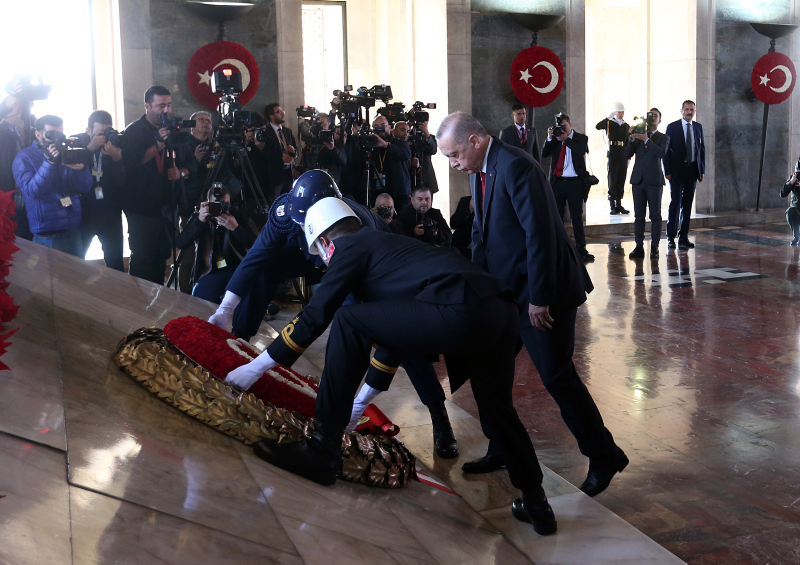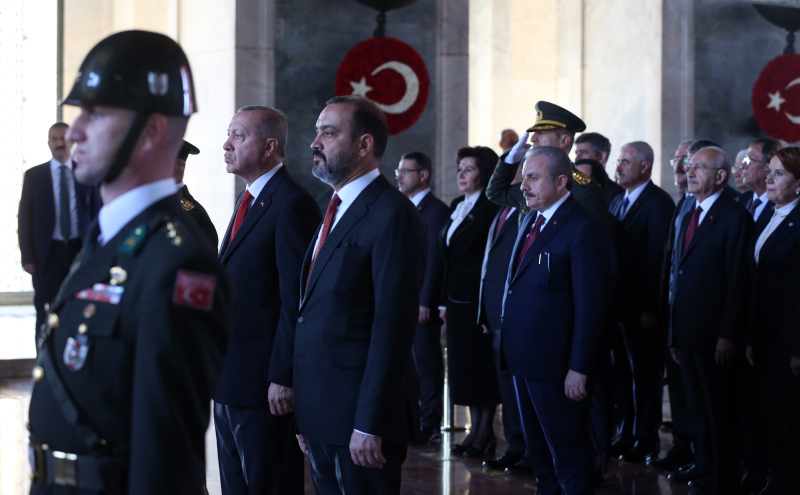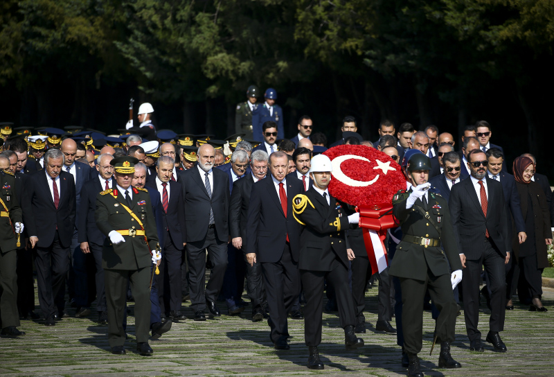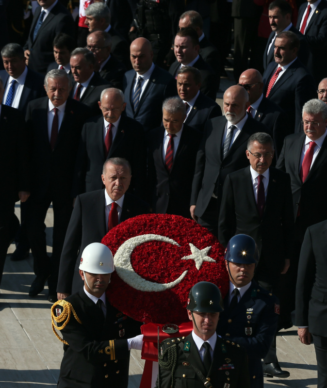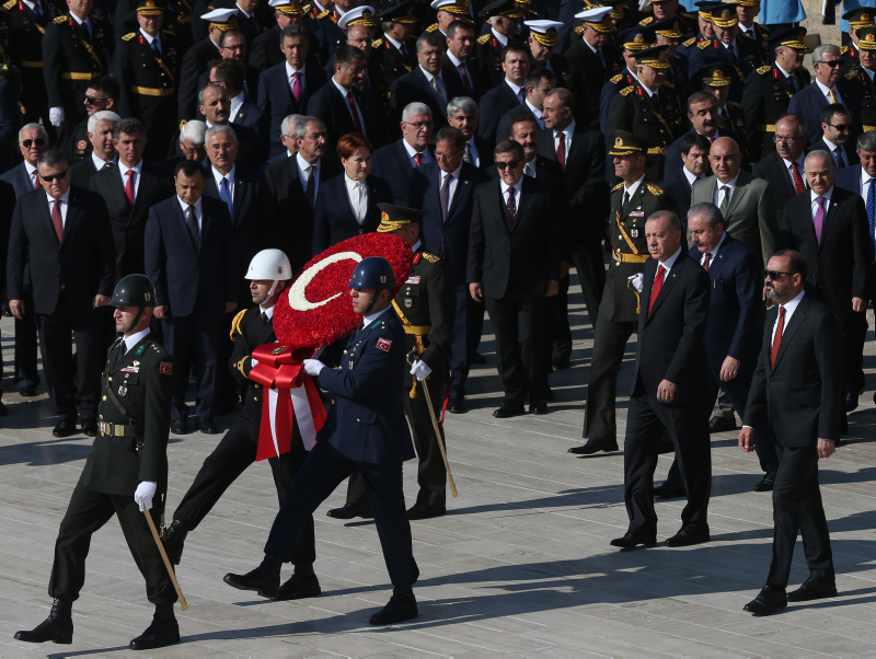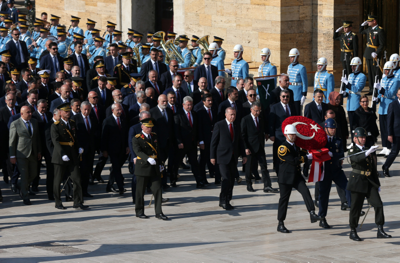 Cumhurbaşkanı Erdoğan ve beraberindekiler, Aslanlı Yol'dan geçerek, Atatürk'ün mozolesine geldi. Erdoğan'ın, üzerinde ay yıldız bulunan çelengi Atatürk'ün mozolesine bırakmasının ardından, saygı duruşunda bulunuldu, İstiklal Marşı okundu.