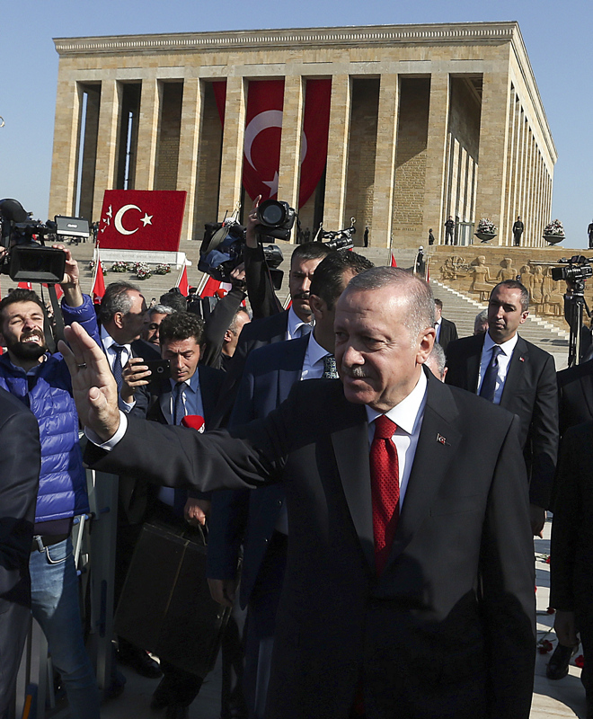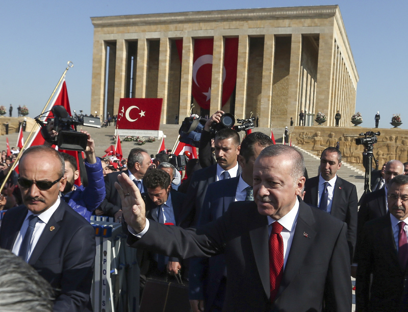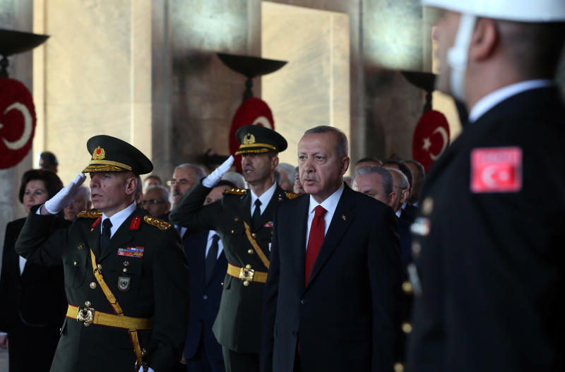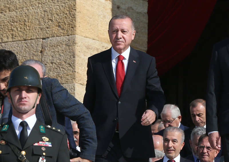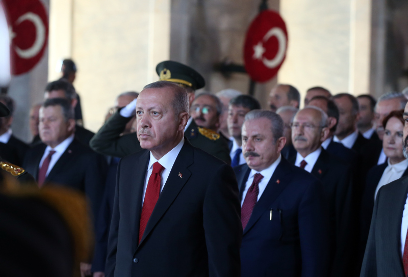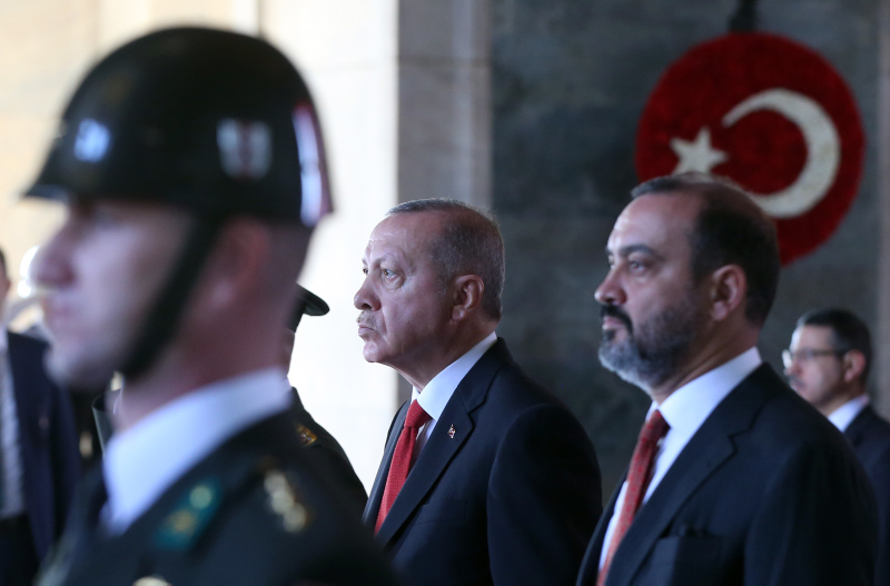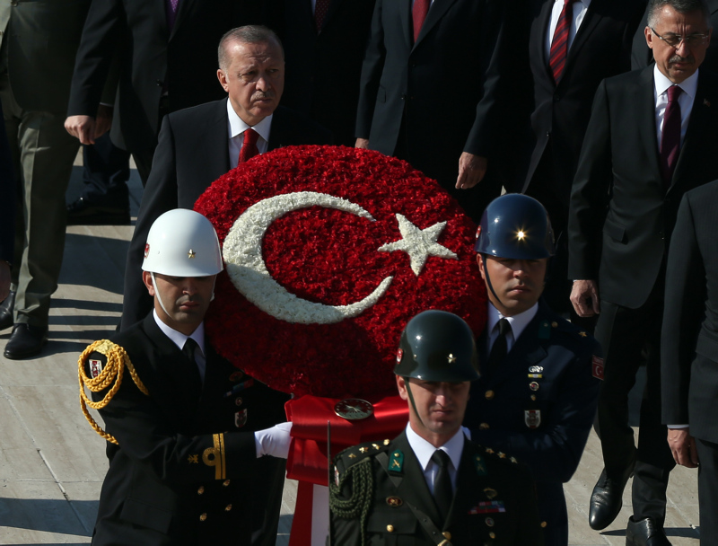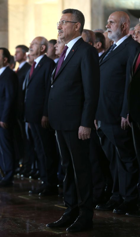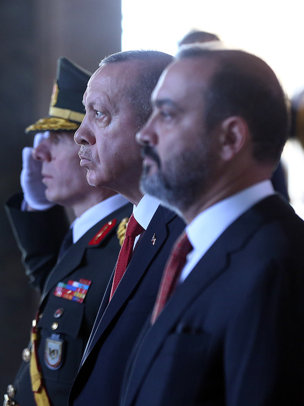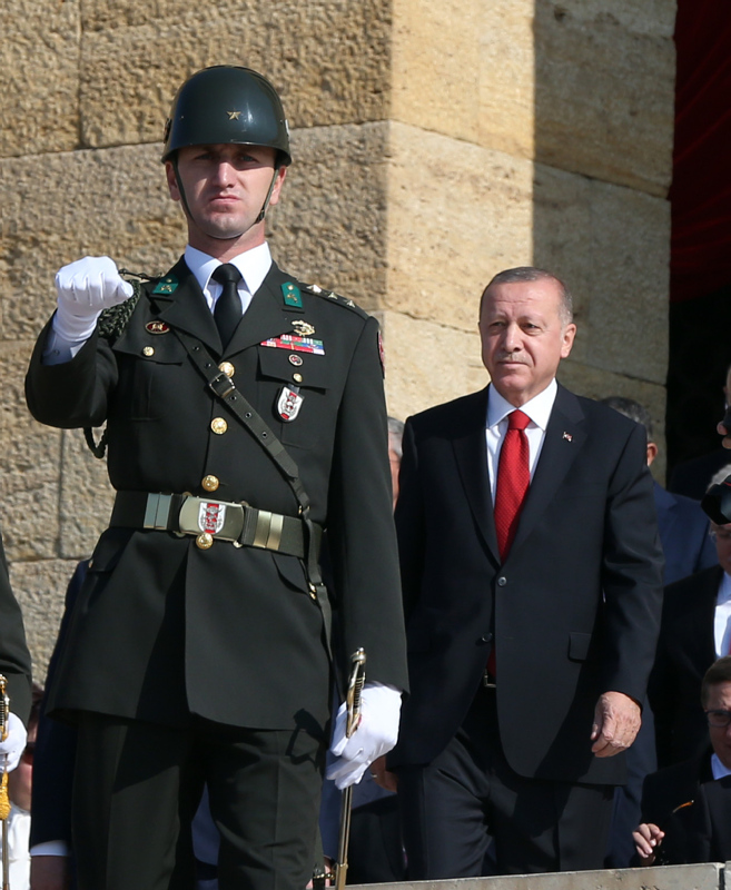 Cumhurbaşkanı Erdoğan ve beraberindekiler, Aslanlı Yol'dan geçerek, Atatürk'ün mozolesine geldi. Erdoğan'ın, üzerinde ay yıldız bulunan çelengi Atatürk'ün mozolesine bırakmasının ardından, saygı duruşunda bulunuldu, İstiklal Marşı okundu.