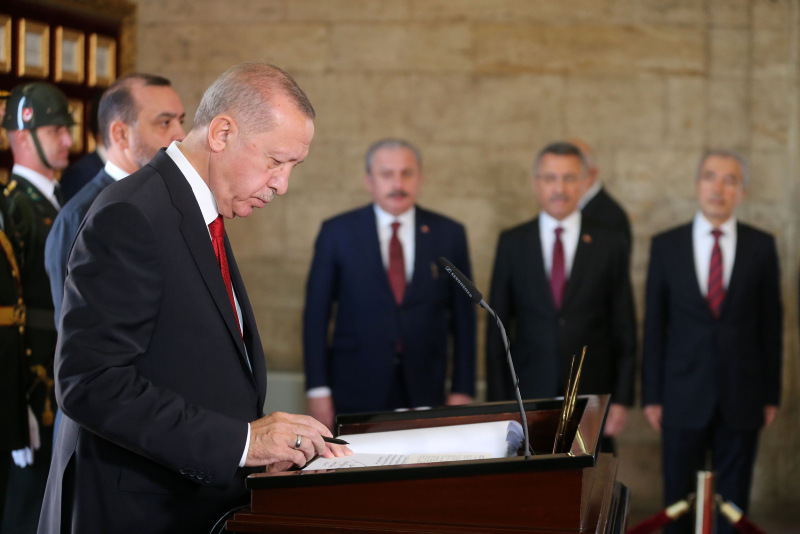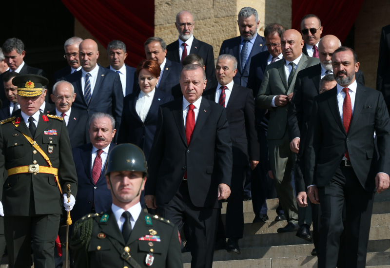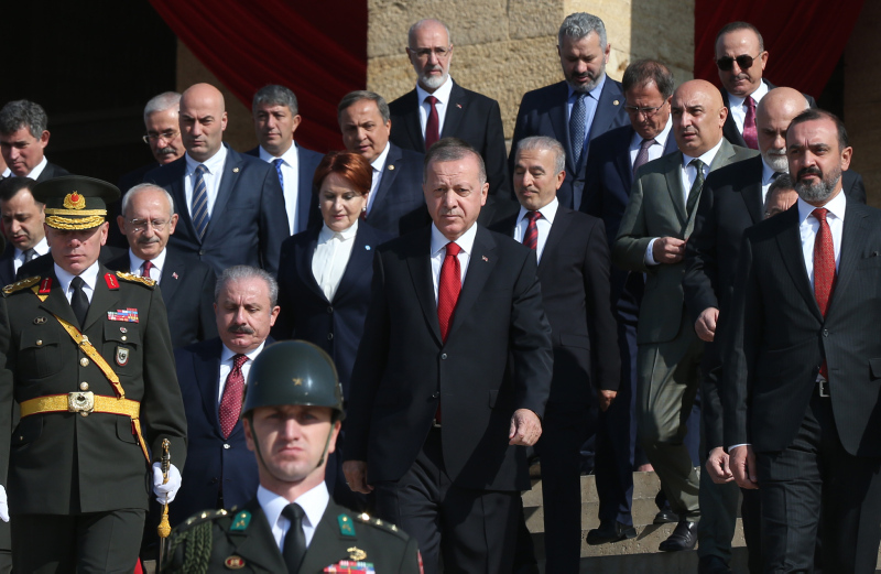 Erdoğan'a, Türkiye Büyük Millet Meclisi (TBMM) Başkanı Mustafa Şentop, Cumhurbaşkanı Yardımcısı Fuat Oktay, CHP Genel Başkanı Kemal Kılıçdaroğlu, İYİ Parti Genel Başkanı Meral Akşener, yüksek yargı temsilcileri, Cumhurbaşkanlığı kabinesi üyeleri, siyasi parti temsilcileri, kuvvet komutanları ile diğer devlet erkanı eşlik etti.