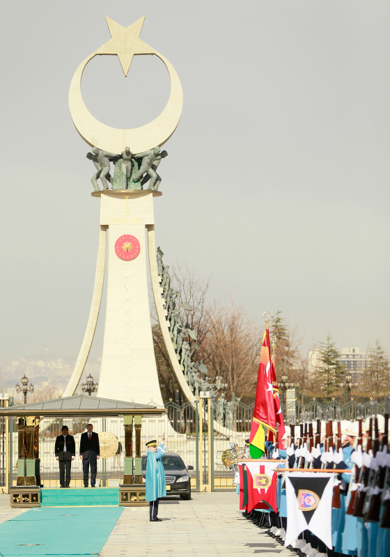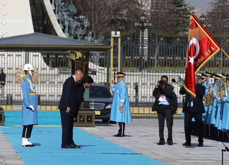 Erdoğan ve Morales'in tören alanındaki yerlerini almalarının ardından, 21 pare top atışı eşliğinde iki ülkenin milli marşları çalındı.