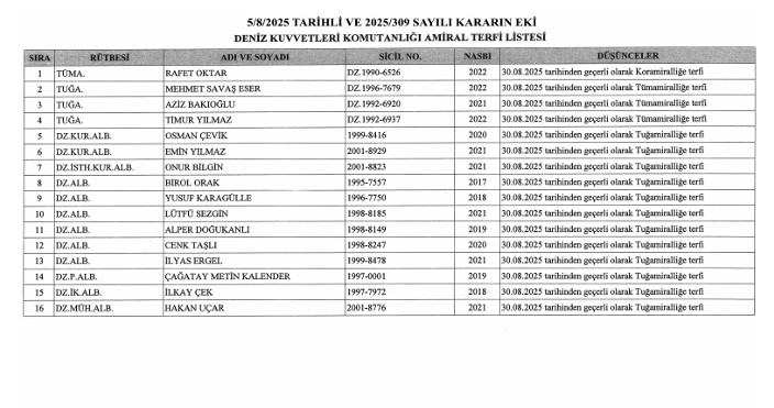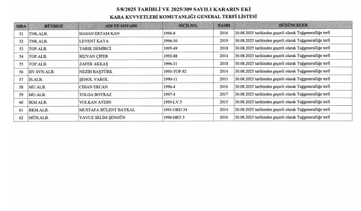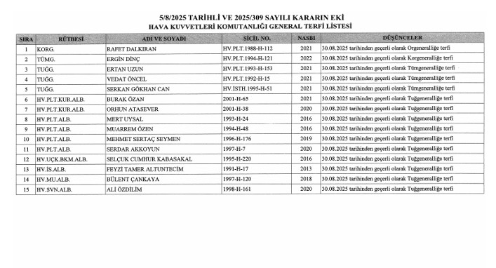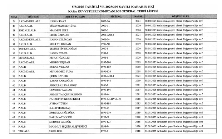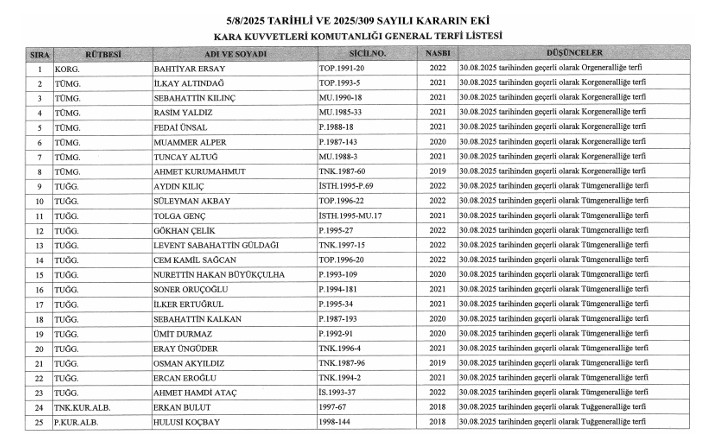 Başkan Recep Tayyip Erdoğan başkanlığında gerçekleştirilen Yüksek Askeri Şura (YAŞ) toplantısında, 32 general ve amiral bir üst rütbeye, 61 albay ise general ve amiralliğe yükseltildi. Söz konusu atama kararları Resmi Gazete'de yayımlanarak yürürlüğe girdi.