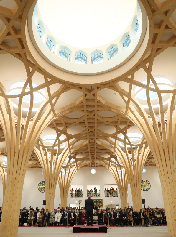 Başkan Recep Tayyip Erdoğan'ın katılımıyla İngiltere'de açılan Cambridge Merkez Camisi, İslami geleneklere bağlı kalınan ödüllü mimarisinin yanı sıra yağmur sularını depolayan, elektriğinin bir kısmını güneş enerjisinden sağlayan çevre dostu sistemleriyle dikkatleri çekiyor.