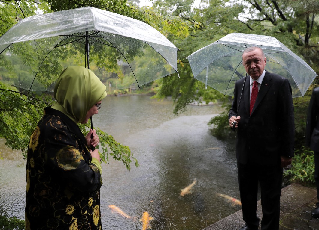 Erdoğan, eşi Emine Erdoğan ile çay seremonisine katıldı. Yere oturan Başkan Erdoğan ve Emine Erdoğan'a geleneksel kimono giyimli kadınlar, çay servisi yaptı.
