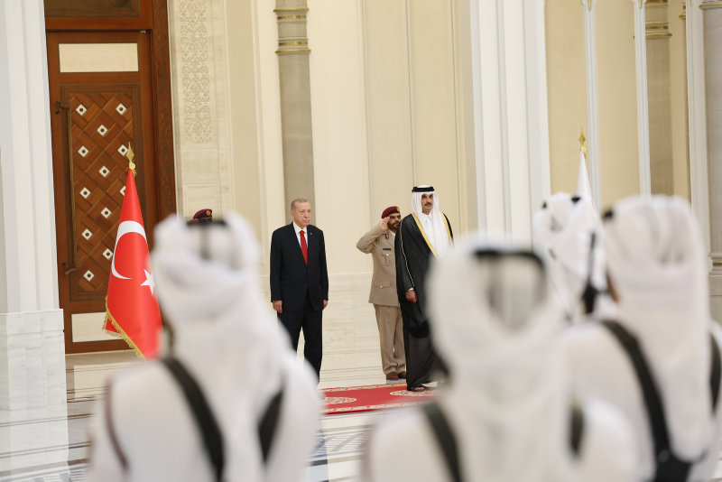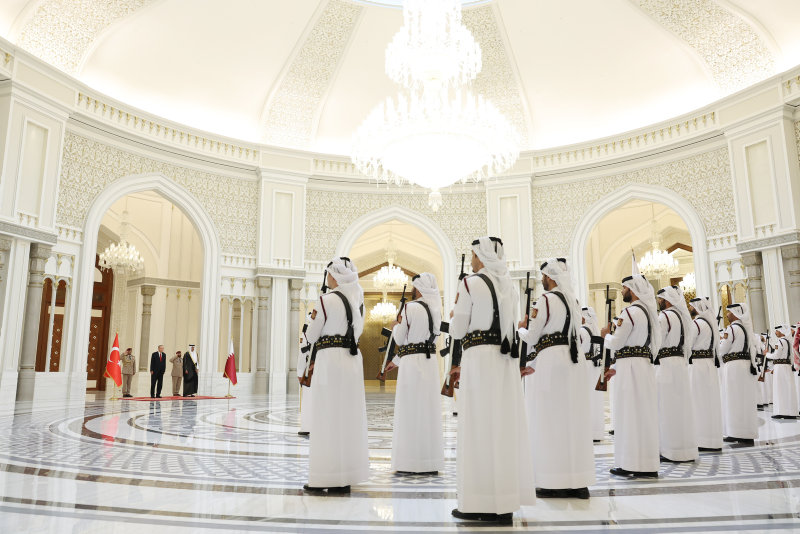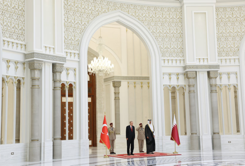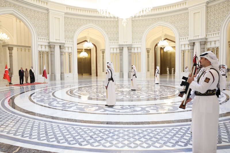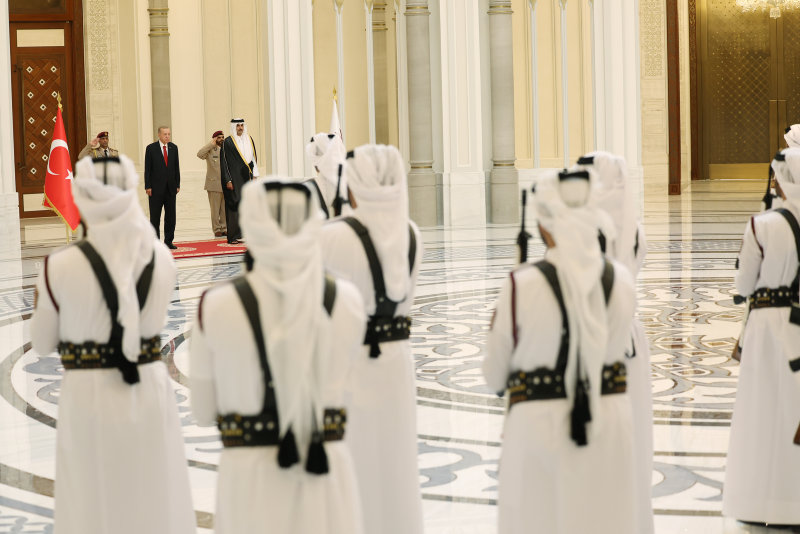 Başkan Recep Tayyip Erdoğan, Körfez ülkeleri turunun ikinci durağı olan Katar'ın başkenti Doha'da Katar Emiri Şeyh Tamim bin Hamad Al Sani tarafından resmi törenle karşılandı.