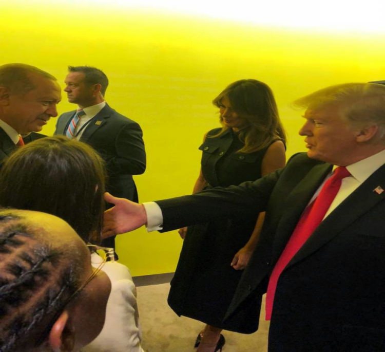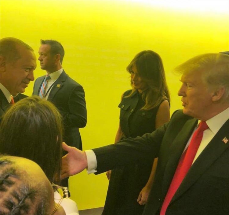 El sıkıştıktan sonra bir süre sohbet eden Cumhurbaşkanı Erdoğan'a eşi Emine Erdoğan, Trump'a da eşi Melania Trump eşlik etti.