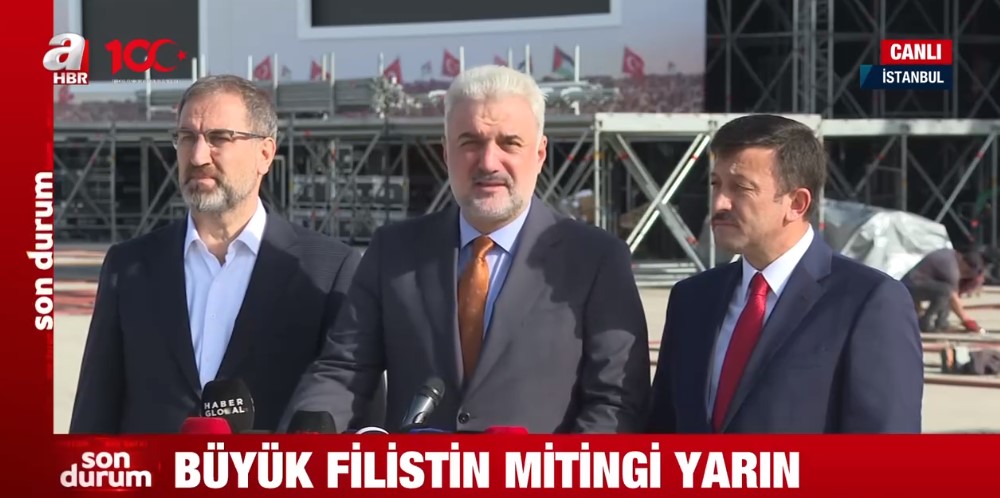 İsrail'in saldırılarına dikkat çekmek ve özgür Filistin davasına destek amacıyla gerçekleştirilecek mitingle ilgili AK Parti Genel Başkan Yardımcıları Hamza Dağ ve Mustafa Şen ile AK Parti İstanbul İl Başkanı Osman Nuri Kabaktepe basın toplantısı düzenledi.