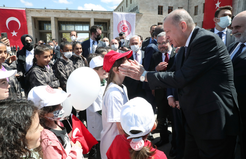 TBMM Başkanı Mustafa Şentop ile birlikte çocuklarla ilgilenen ve sohbet eden Erdoğan, daha sonra Meclis'ten ayrıldı.