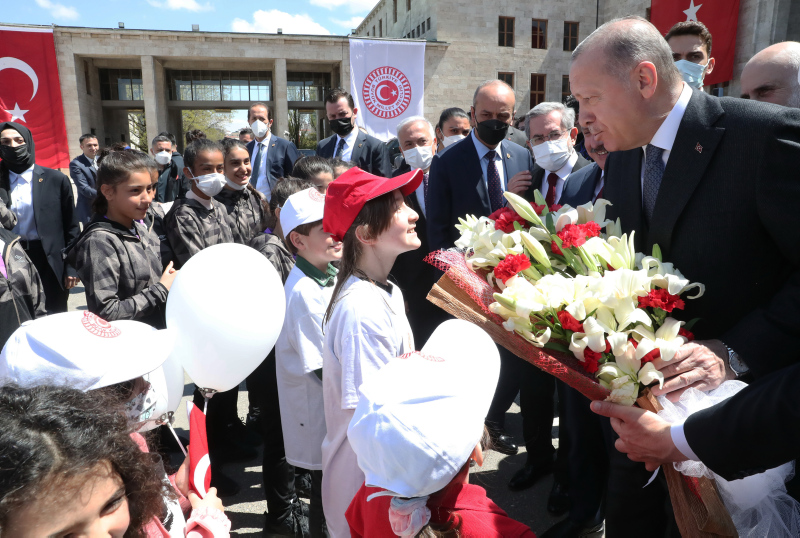 Başkan Erdoğan, partisinin grup toplantısı sonrası TBMM bahçesinde kurulan stantları gezen çocuklarla bir araya geldi.