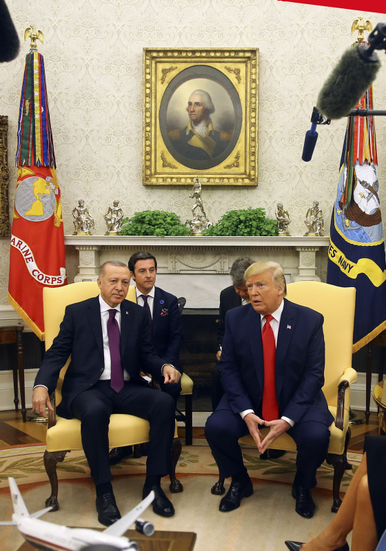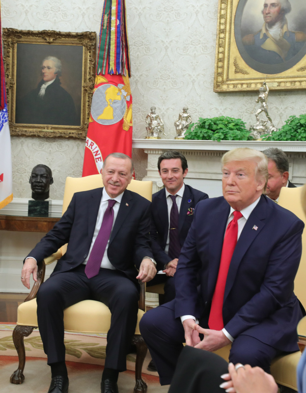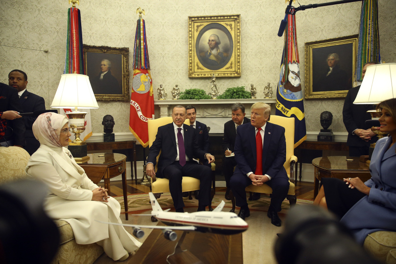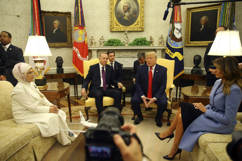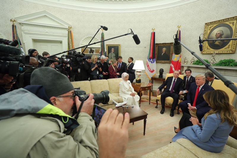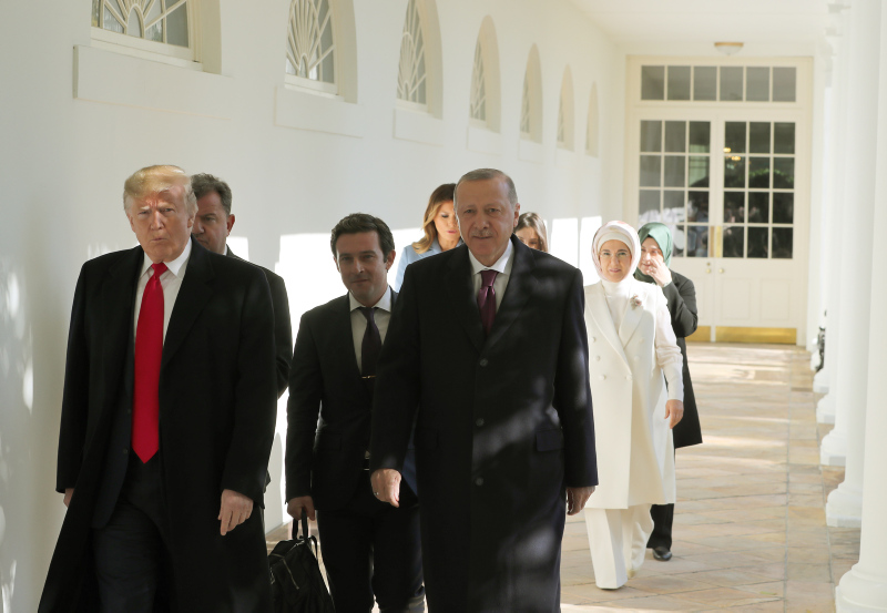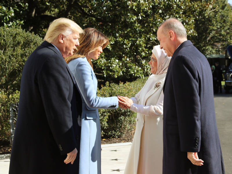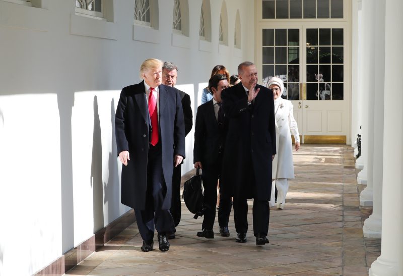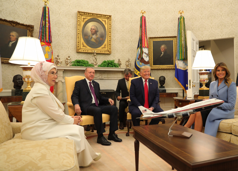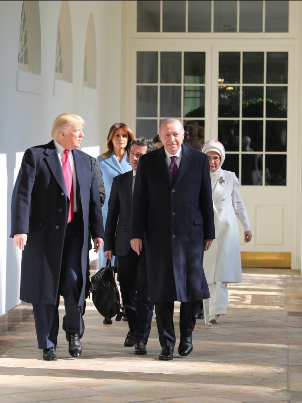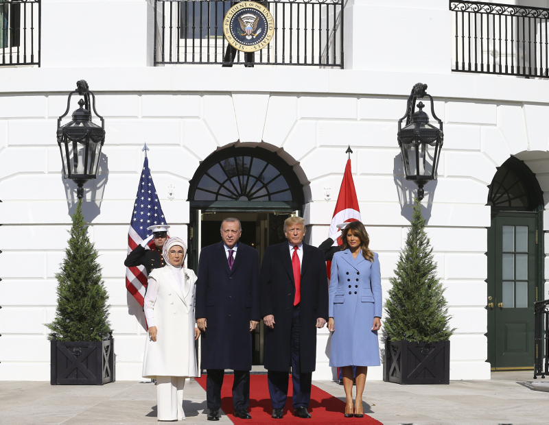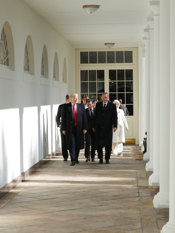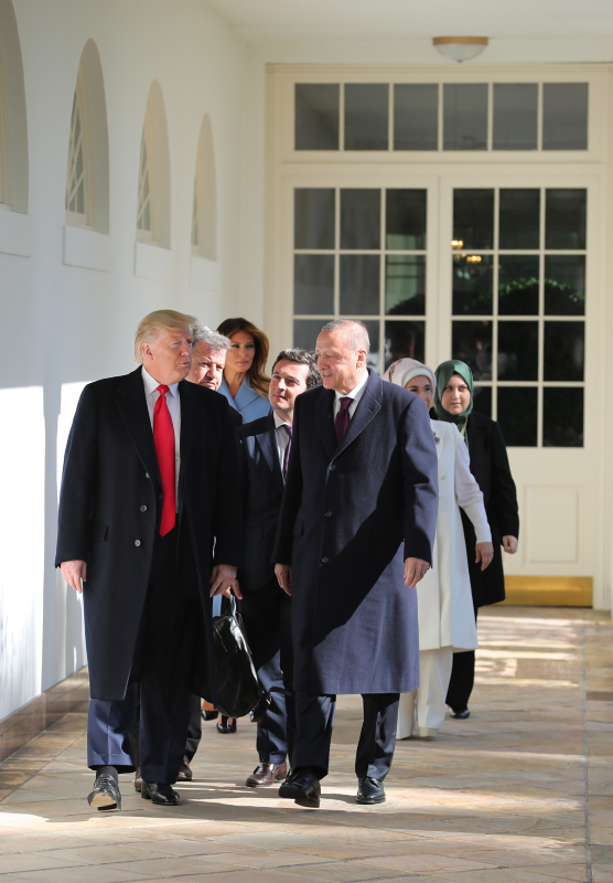 Başkan Recep Tayyip Erdoğan ve eşi Emine Erdoğan, Beyaz Saray'a geldi. Başkan Erdoğan ve Emine Erdoğan'ı ABD Başkanı Trump ve eşi karşıladı. Ve artık gözler Beyaz Saray'daki Başkan Recep Tayyip Erdoğan ile ABD Başkanı Donald Trump görüşmesine çevrildi. Beyaz Saray'da önce baş başa, sonra da heyetler arası görüşmede bir araya gelecek iki liderin ajandasında birçok önemli dosya bulunuyor. Suriye'nin kuzeyinde varılan mutabakat ve ABD'nin terör örgütü YPG ile olan kirli ilişkisi ele alınacak. Öte yandan Suriye konusundaki krizin çözülememesinin bir diğer nedeni olan YPG/PKK'nın elebaşlarından Mazlum Kobani kod adlı terörist Ferhat Abdi Şahin'in Washington'a davet edilmesi konusu da Erdoğan'ın çantasındaki önemli dosyalardan biri.