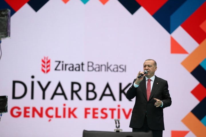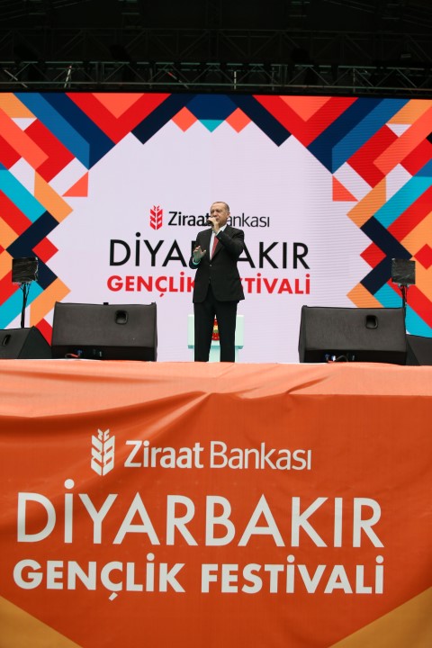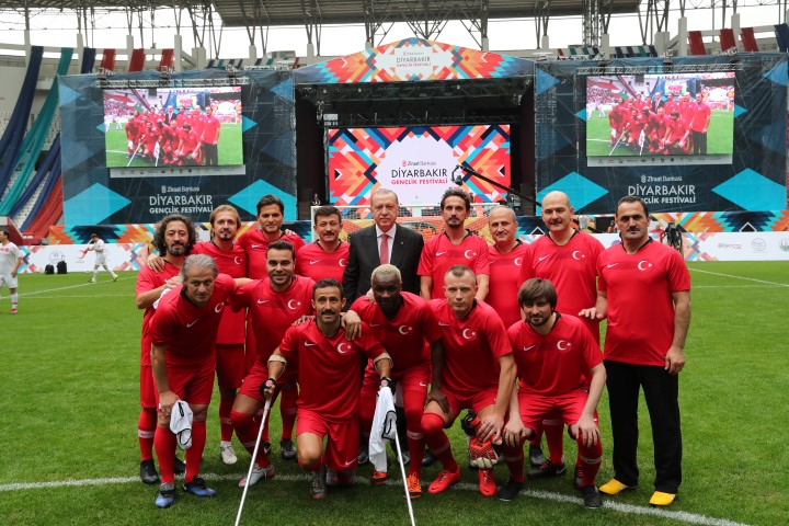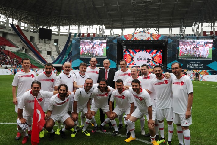 Başkan Erdoğan, bölge gençlerini sanat, spor ve eğlenceyle buluşturmanın amaçlandığı, Ziraat Bankası Diyarbakır Gençlik Festivali kapsamında gerçekleştirilen "Şöhretler Karması" maçının başlama vuruşunu yaptı.