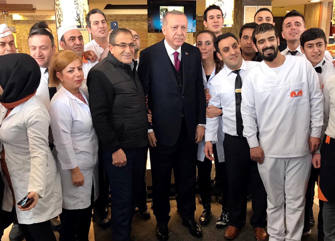Erdoğan, güzergahtaki Terminal Caddesi'nde de otobüsünü durdurup bir işyerine girerek çalışanlar ile sohbet etti.