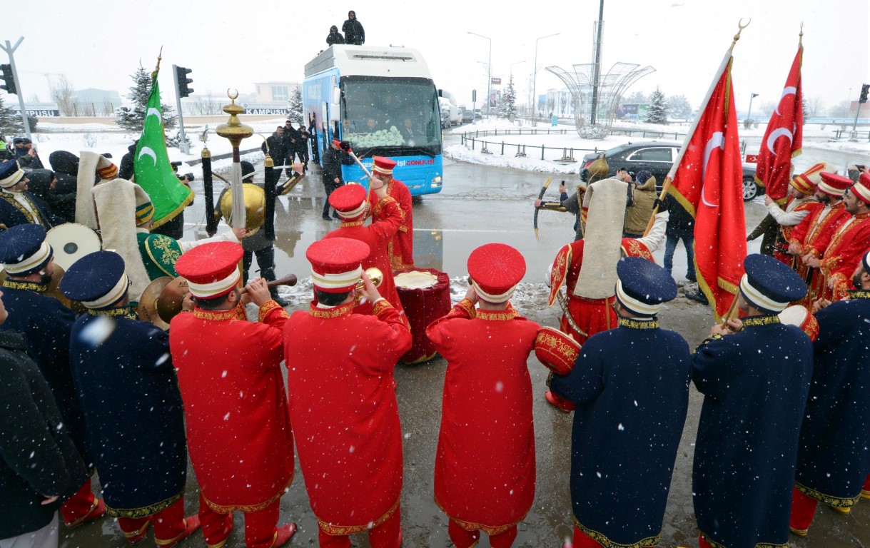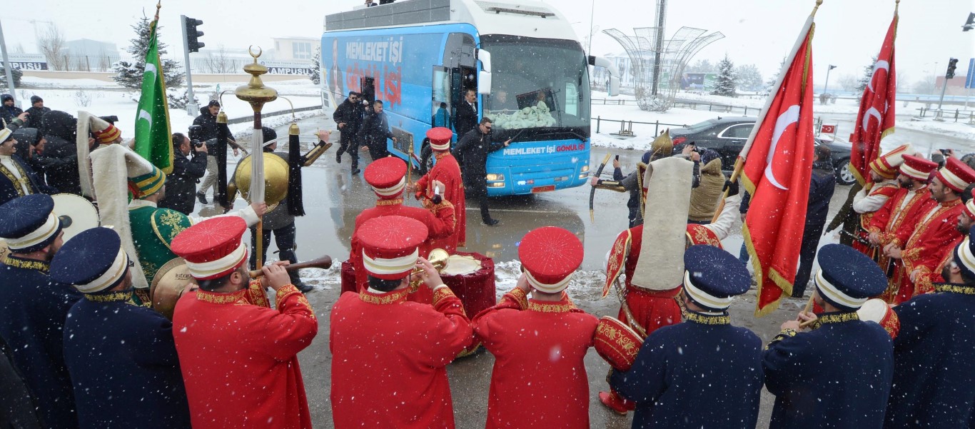 Eski Havalimanı Kavşağı'nda da Erzurum Büyükşehir Belediyesine ait Mehteran Takımı'nın karşıladığı Erdoğan, burada da vatandaşlara kitap ve çay dağıttı.