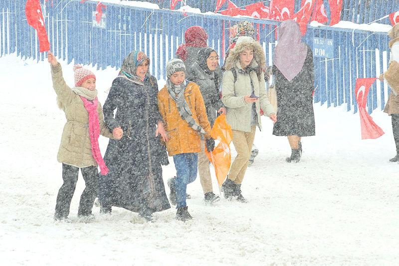 Güzergah boyunca kar yağışı altında bekleyen çok sayıda vatandaş, ellerindeki Türk bayraklarını sallayarak Erdoğan'a sevgi gösterisinde bulundu.