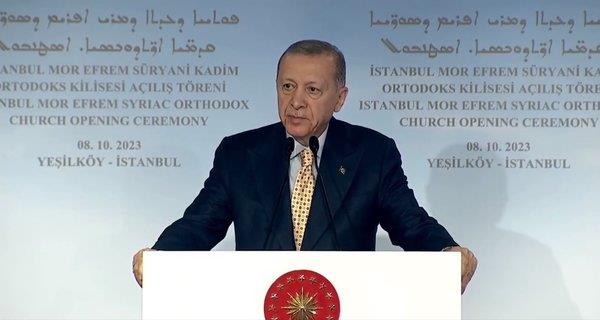 Başkan Recep Tayyip Erdoğan, Yeşilköy'deki Mor Efrem Süryani Kadim Ortodoks Kilisesi açılış töreninde açıklamalarda bulundu. Başkan Erdoğan, açılış konuşmasını "Lâ ilâhe illallah, İbrahim halîlullah" ifadeleriyle taçlandıran Başkan Erdoğan, "Kanuni Sultan Süleyman tarafından El Halil kapısının üzerine yazdırılan, 'La ilahe illallah, İbrahim halilullah' ifadesi, atalarımızın ihtimamının en güzel sembolüdür." vurgusunu yaptı. Öte yandan Başkan Erdoğan vatandaşlar tarafından büyük sevgi bir seli ile karşılandı.