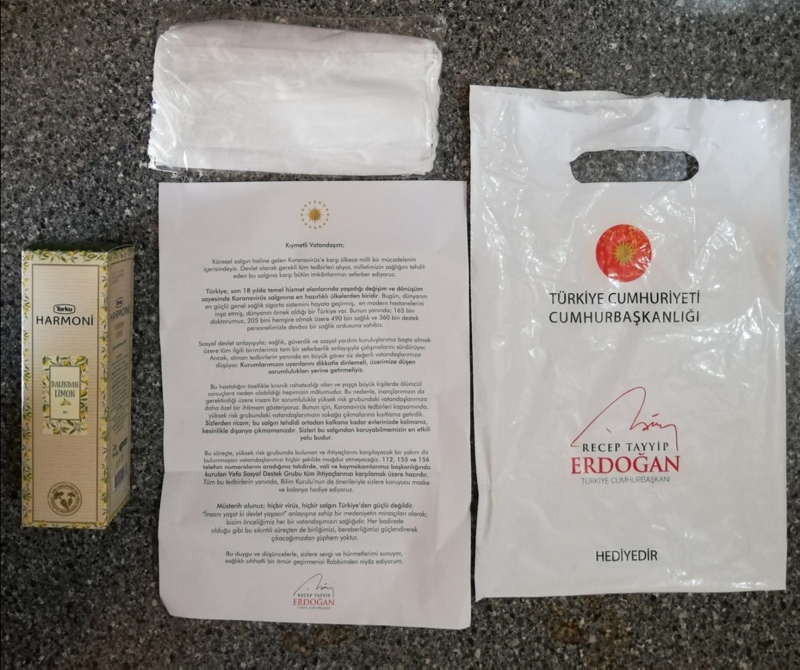 Başkan Recep Tayyip Erdoğan tarafından 65 yaş ve üstü vatandaşlara içinde maske ile kolonyaların bulunduğu hijyen paketi gönderildi. Vefa Sosyal Destek Grubu ekipleri, maske ve kolonyaları "Cumhurbaşkanımız Recep Tayyip Erdoğan'ın size selamı var" diyerek vatandaşlara teslim etti. Paketlerini alan vatandaşlar ise "Bizleri unutmuyor. Allah ondan da sizden de yüz bin kere razı olsun, Teşekkür ediyorum" dedi.