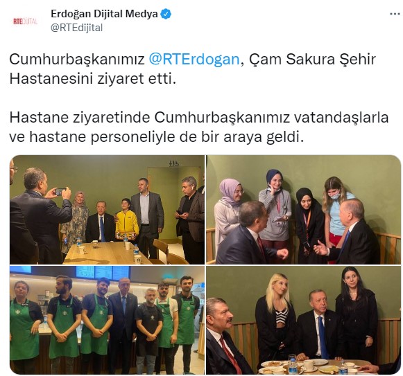 Başkan Erdoğan, Çam Sakura Şehir Hastanesini ziyaret etti. Hastane ziyaretinde Başkan Recep Tayyip Erdoğan, vatandaşlarla ve hastane personeliyle de bir araya geldi. Diğer yandan Doktorlar, özlük haklarının iyileştirilmesini içeren Beyaz Reform, sağlıkta şiddetin önlenmesi ve malpraktis yasası düzenlemeleri dolayısıyla Başkan Recep Tayyip Erdoğan'a teşekkür etti.
