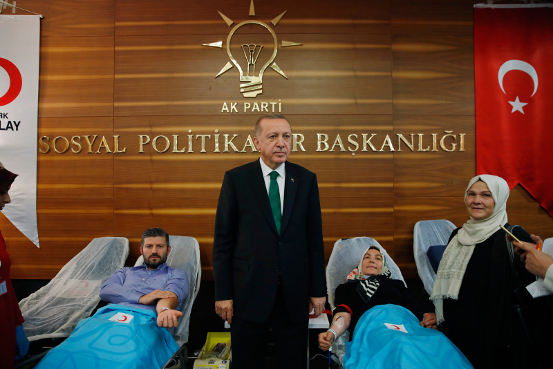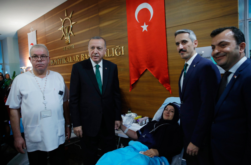 Türkiye Cumhurbaşkanı ve AK Parti Genel Başkanı Recep Tayyip Erdoğan, partisinin genel merkezinde Kızılay Haftası dolayısıyla açılan kan bağışı standını ziyaret etti.