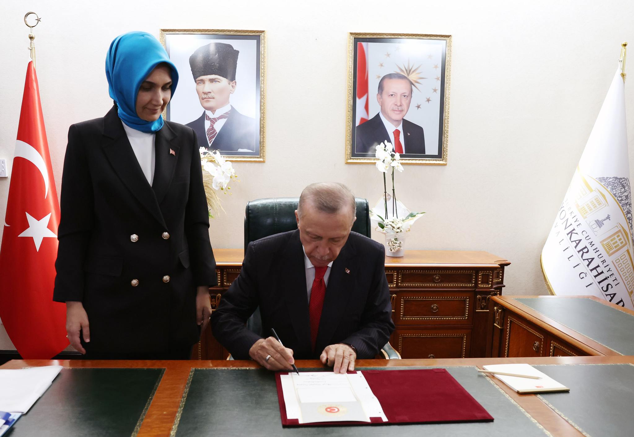 Afyonkarahisar'da düzenlenen Büyük Taarruz'un 100. Yıl Dönümü Kutlamaları ve Toplu Açılış Töreni'ne katılan Başkan Recep Tayyip Erdoğan, belediye başkanlığı ve valiliğe ziyarette bulundu. Erdoğan, ziyarette Türkiye'nin ilk başörtülü valisi Kübra Güran Yiğitbaşı'ndan kentte yürütülen çalışmalar hakkında bilgi aldı.