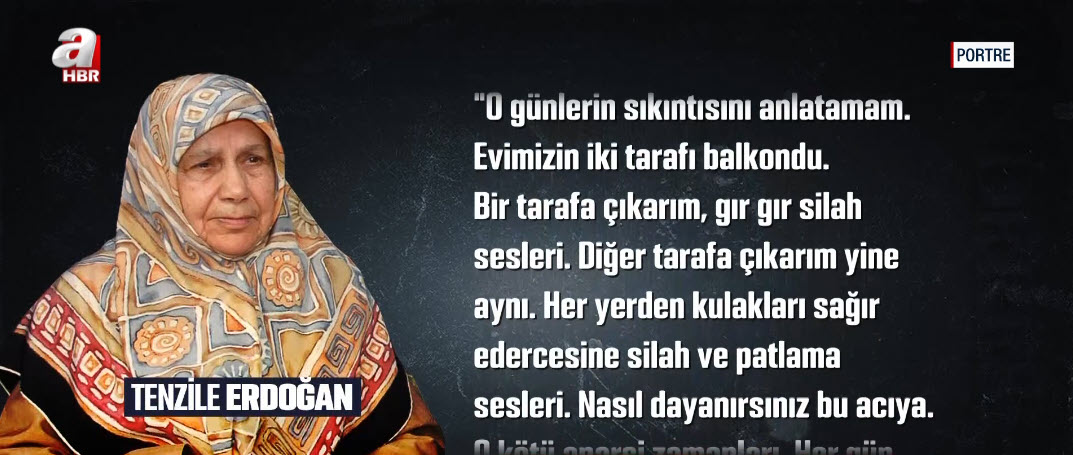 Dün ne yazık ki Saraçhane'de yaşanan o olaylar sırasında Başkan Erdoğan'ın ailesi ve rahmetli annesi Tenzile Erdoğan'a yönelik skandal sözler sarf edildi. Bir anneye yönelik söylenen o sözler kabul edilebilir ya da siyaseten de karşılığı olabilecek bir durum değil... Başkan Erdoğan annesi Tenzile Erdoğan'ı 7 Ekim 2011'de ebediyete uğurladı. Cenazede gözyaşlarına engel olamamıştı... Biz de bir kez daha Tenzile Erdoğan ve Hakk'ın rahmetine kavuşan tüm annelere bir kez daha Allah'tan rahmet diliyoruz. İşte Tenzile Erdoğan'ın portresi…