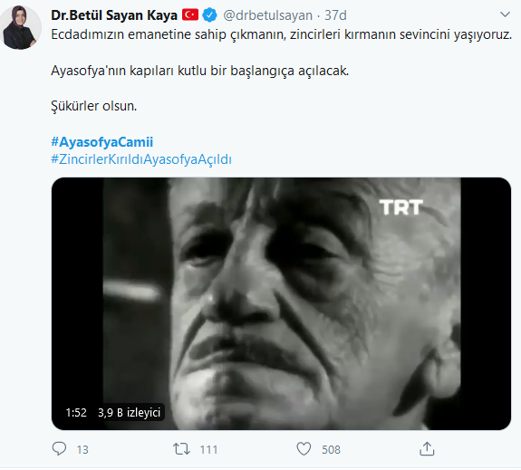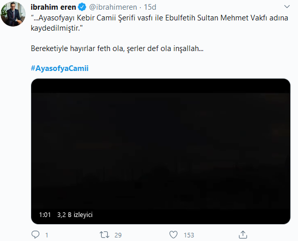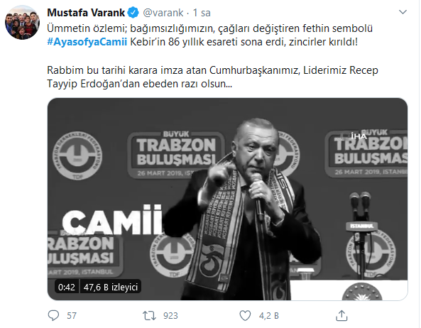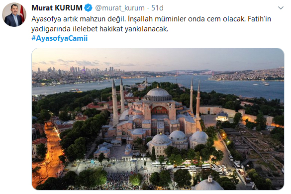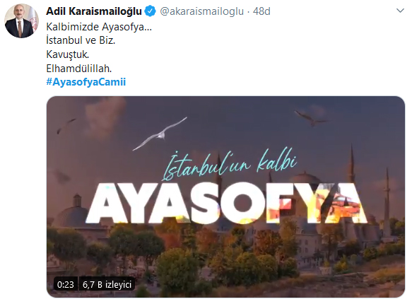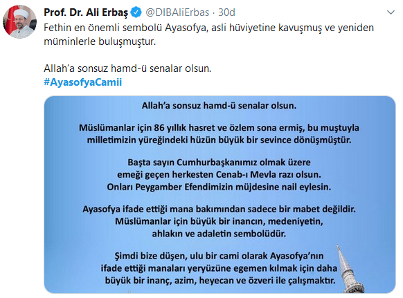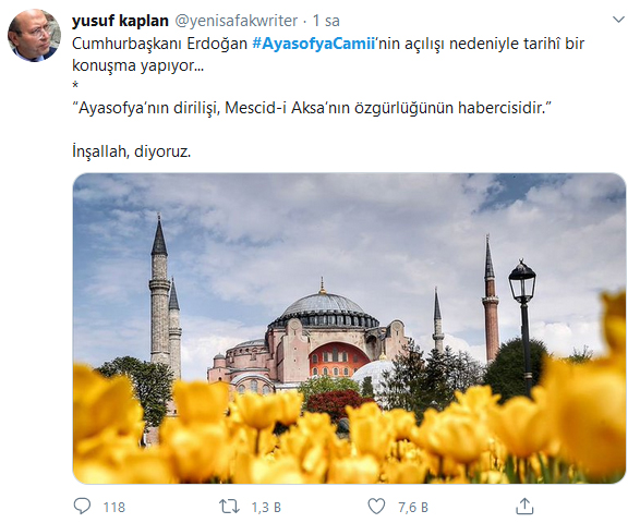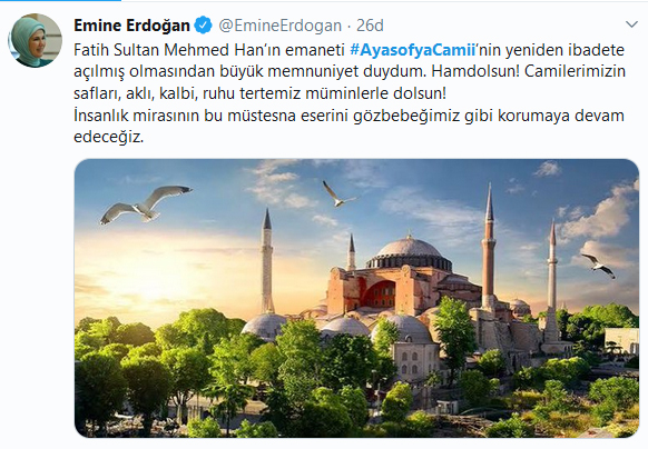 Başkan Recep Tayyip Erdoğan, Ayasofya'nın yeniden ibadete açıldığını duyurdu. İlk namaz ise 24 Temmuz cuma günü kılınacak. Başkan Erdoğan'ın Ayasofya kararını sosyal medyada büyük yankı uyandırdı. Sanat ve siyaset camiasından birçok kişi, mutluluğunu Twitter'dan paylaştı.