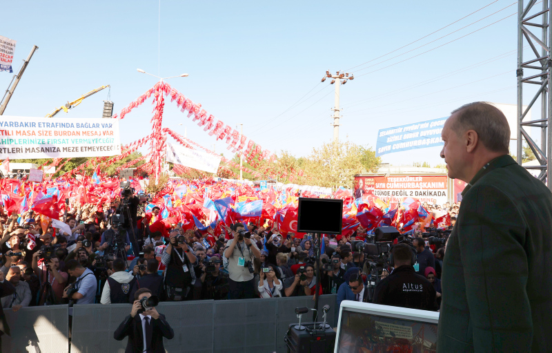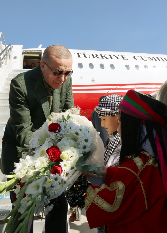 Malatya'dan özel uçakla Diyarbakır'a gelen Başkan Recep Tayyip Erdoğan, havaalanından otobüs ile toplu açılış programının yapılacağı İstasyon Meydanı'na geçti.