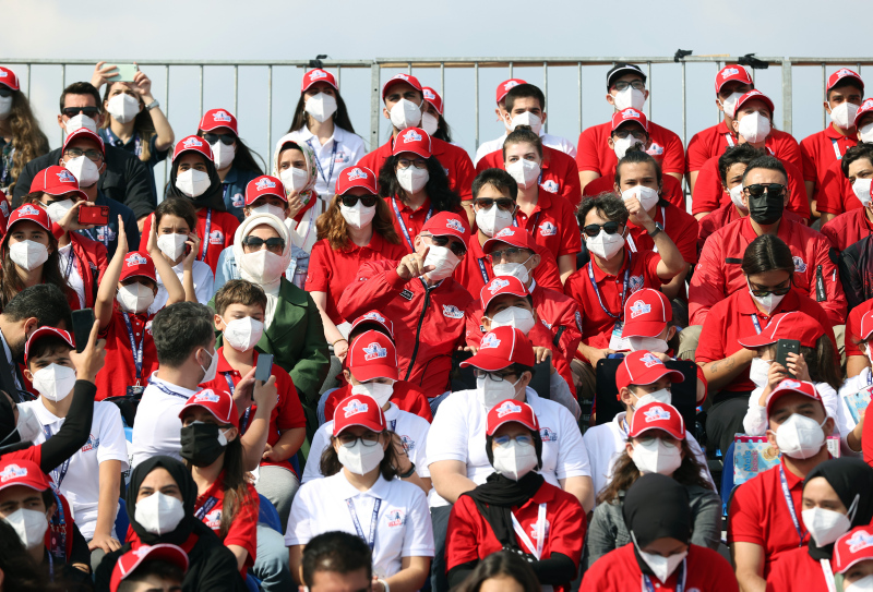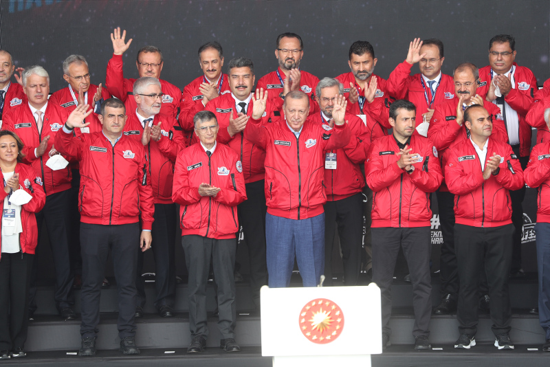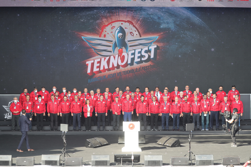 TEKNOFEST'in kırmızı pilot montunu giyen Erdoğan'a, T3 Vakfı Mütevelli Heyeti Başkanı ve TEKNOFEST Yönetim Kurulu Başkanı Selçuk Bayraktar tarafından TEKNOFEST şapkası takdim edildi.