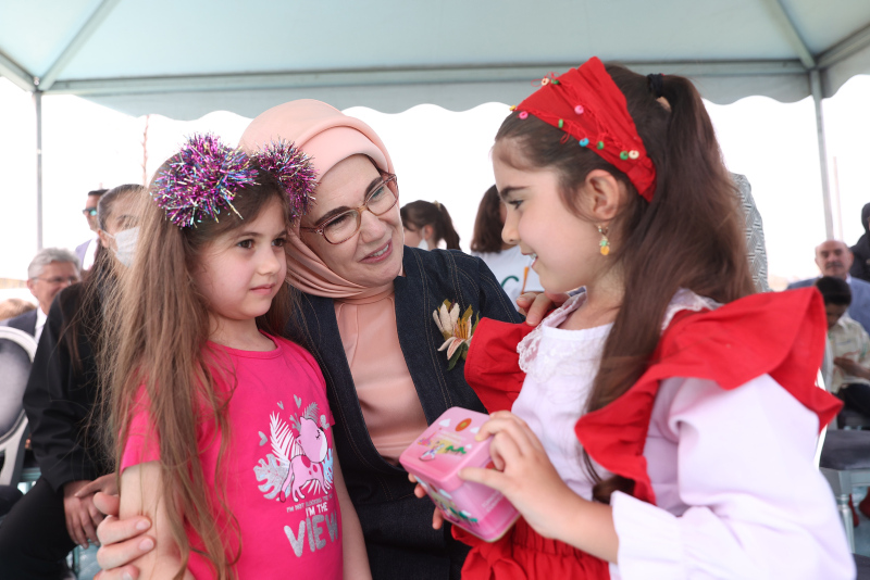 Erdoğan, Şair Nazım Hikmet'in "Dünyayı Verelim Çocuklara" şiirinden, "Dünyayı verelim çocuklara hiç değilse bir günlüğüne. Allı pullu bir balon gibi verelim oynasınlar, oynasınlar türküler söyleyerek yıldızların arasında. Dünyayı çocuklara verelim kocaman bir elma gibi verelim. Sıcacık bir ekmek somunu gibi. Hiç değilse bir günlüğüne doysunlar. Dünyayı çocuklara verelim bir günlük de olsa öğrensin dünya arkadaşlığı. Çocuklar dünyayı alacak elimizden. Ölümsüz ağaçlar dikecekler." dizelerini okuyarak, "Evet dünyayı çocuklara verdiğimiz gün her şeyin daha vicdanlı, daha şefkatli, daha sevecen olduğunu göreceğiz." diye konuştu.