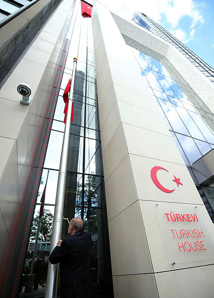 Başkan Erdoğan, açılış için geldiği Türkevi'nde ilk olarak bina girişinde düzenlenen bayrak çekme törenine katıldı.