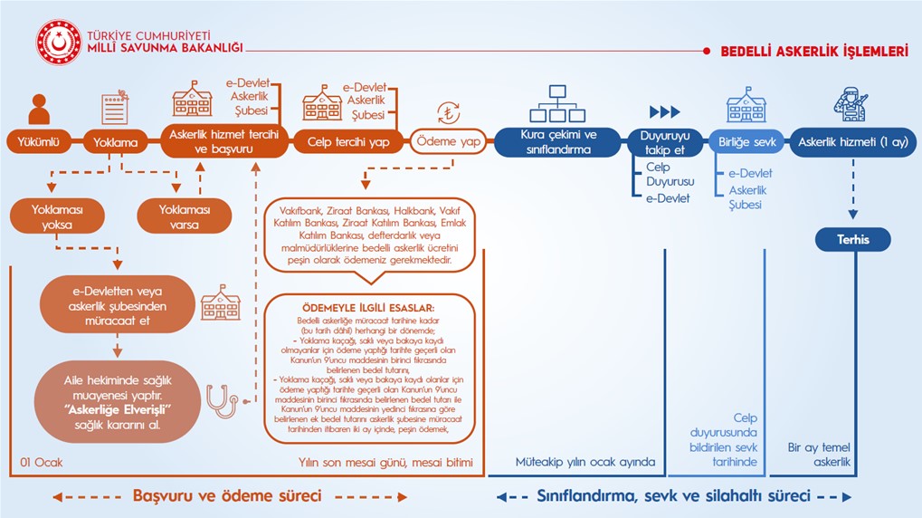 Başvuru yapmak isteyenler e-Devlet üzerinden veya askerlik şubelerinden başvuru yapabilir. Bedelli askerlik başvuruları ile ilgili herhangi bir zaman kısıtlaması bulunmuyor. Ancak, Askeralma Yönetmeliği'nin 61'inci Maddesi gereğince içinde bulunulan yılın 31 Aralık tarihi mesai bitimine kadar yoklama işleminin tamamlanması ve bedelin başvuru tarihinden itibaren iki ay içinde, son ödeme tarihinden önce sınıflandırılmanız durumunda ise bakaya kalma tarihine kadar ödenmesi gerekiyor.