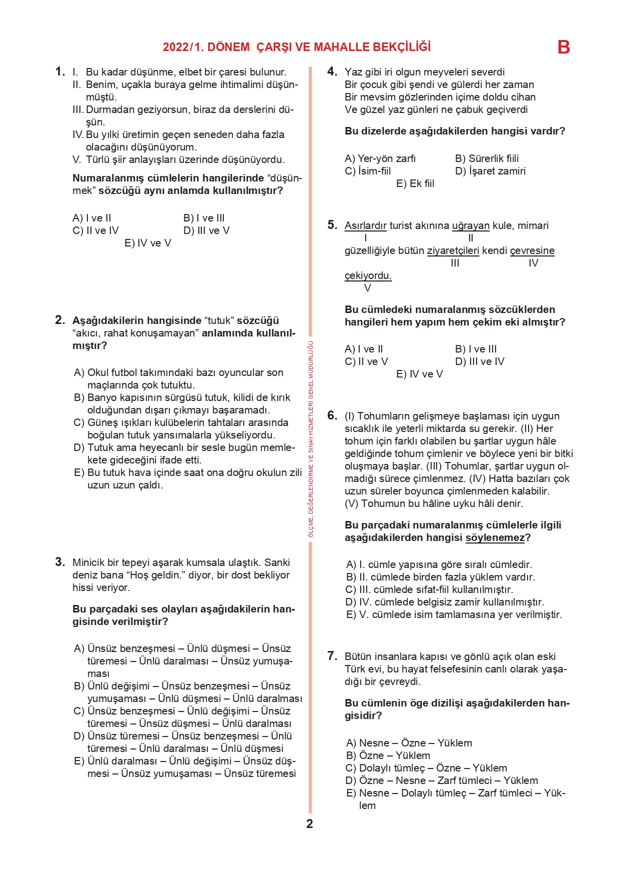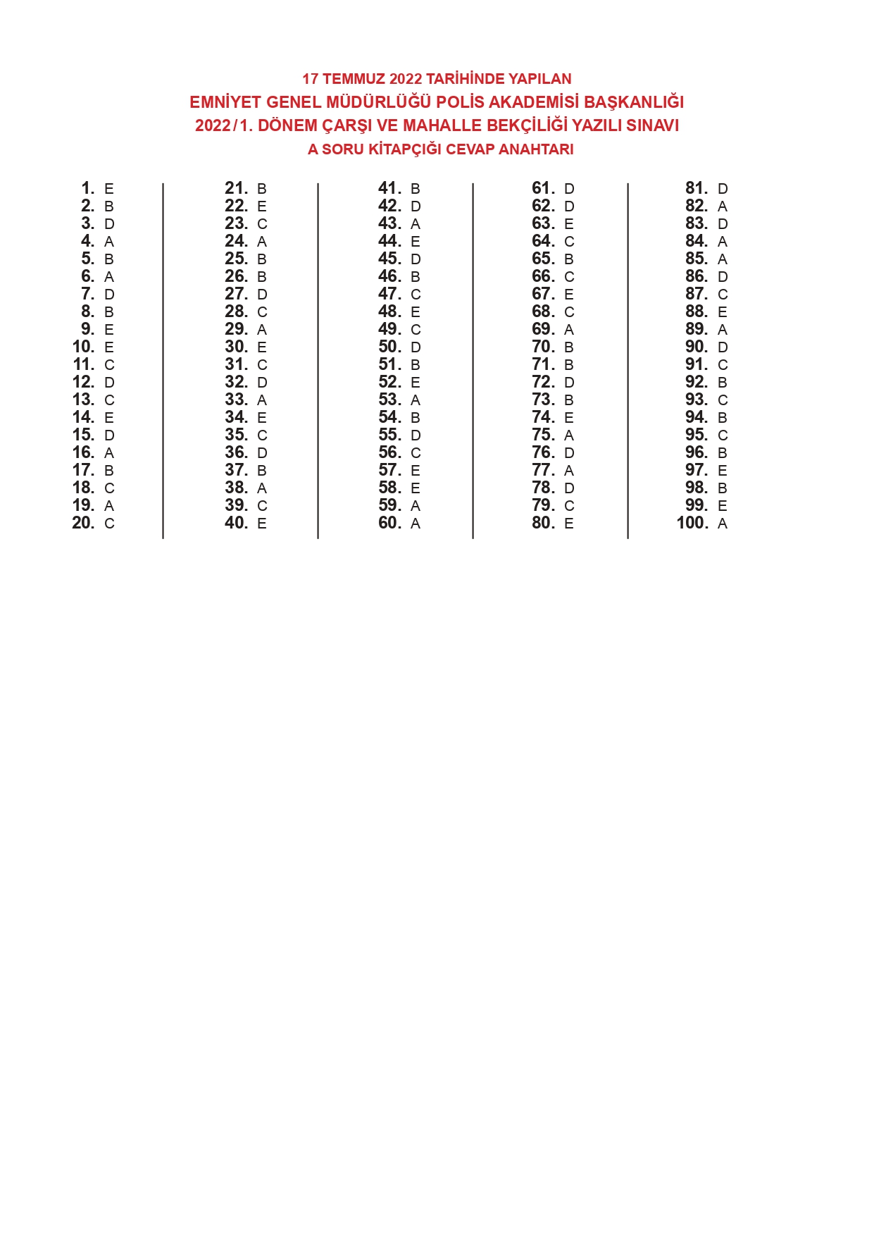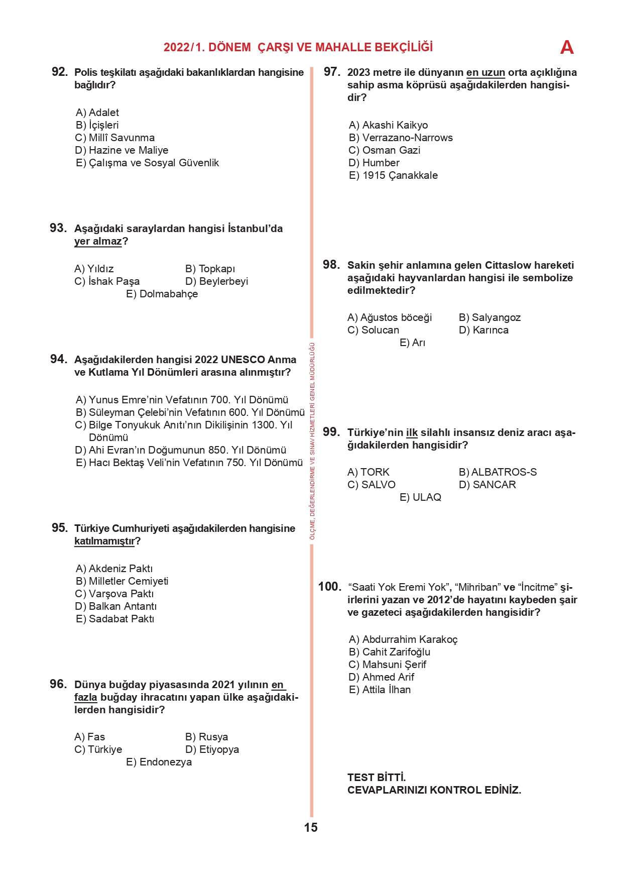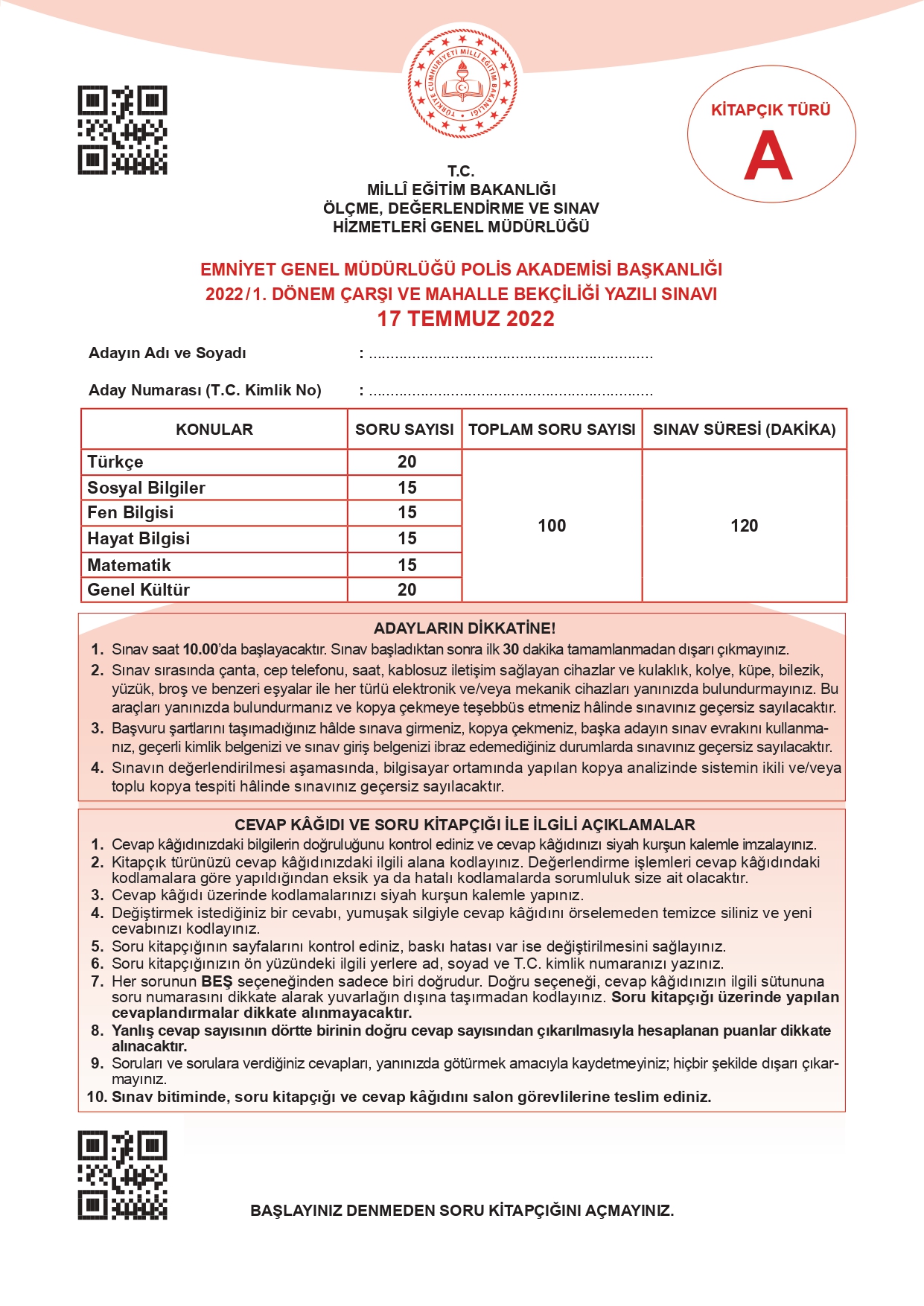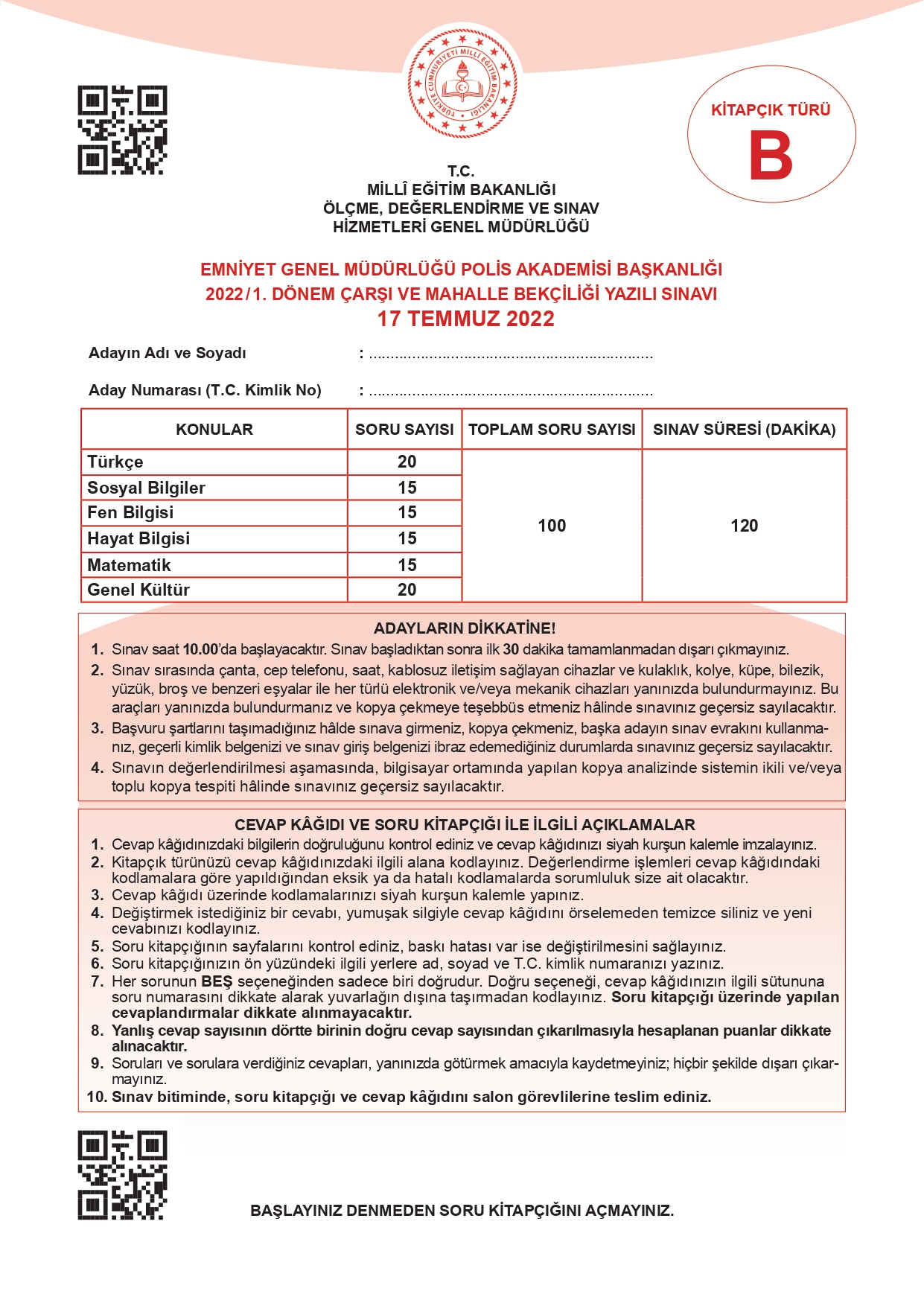 17 Temmuz 2022 tarihinde yapılan 2022/1. Dönem Çarşı ve Mahalle Bekçiliği Yazılı Sınavının soru kitapçıkları ve cevap anahtarları, Milli Eğitim Bakanlığı'nın Ölçme, Değerlendirme ve Sınav Hizmetleri Genel Müdürlüğü resmi internet adresi üzerinden erişime açıldı.