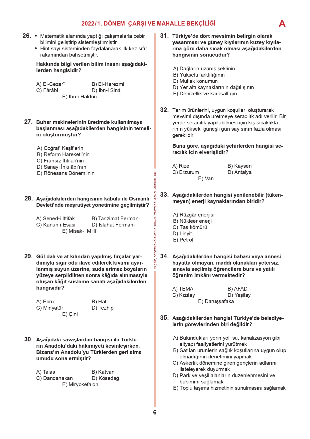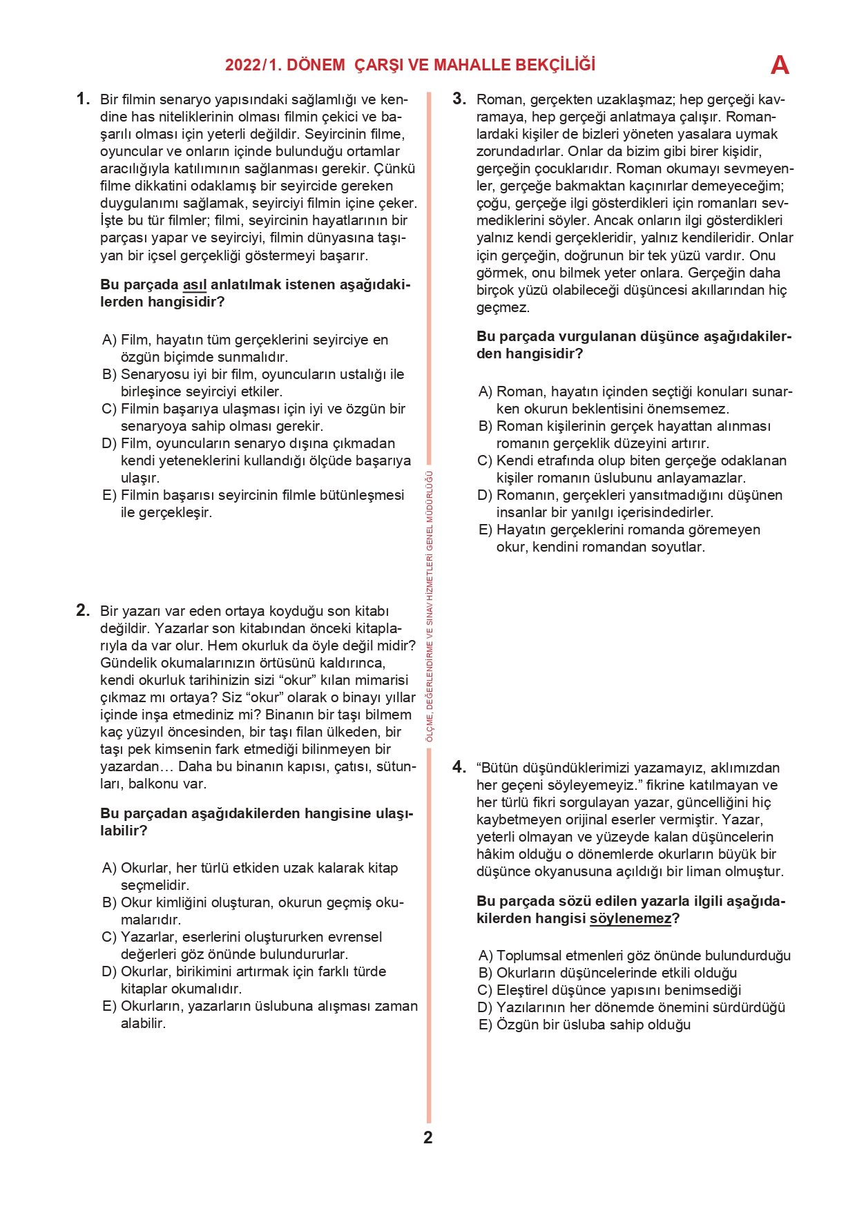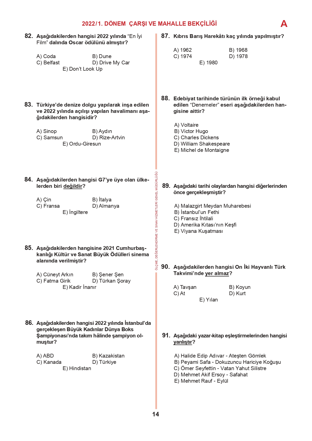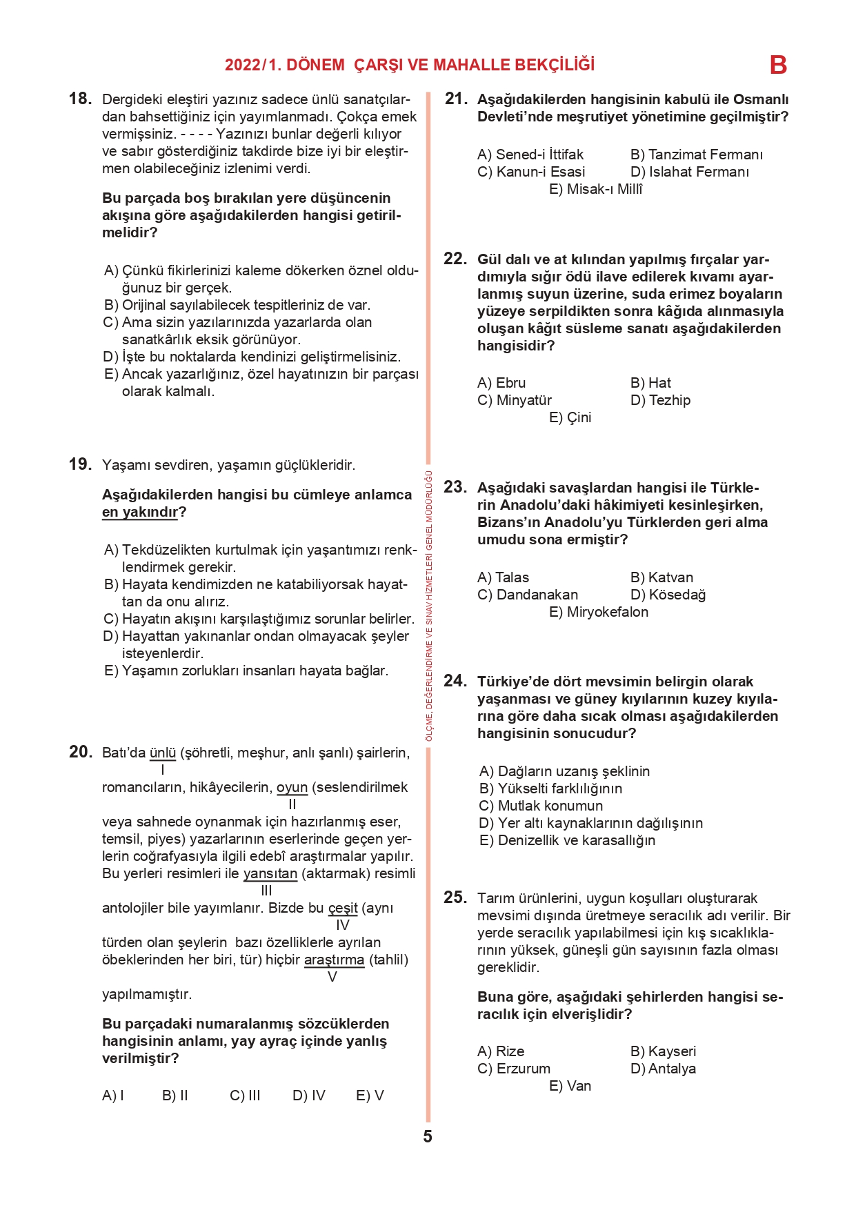 17 Temmuz 2022 tarihinde yapılan 2022/1. Dönem Çarşı ve Mahalle Bekçiliği Yazılı Sınavının soru kitapçıkları ve cevap anahtarları, Milli Eğitim Bakanlığı'nın Ölçme, Değerlendirme ve Sınav Hizmetleri Genel Müdürlüğü resmi internet adresi üzerinden erişime açıldı.