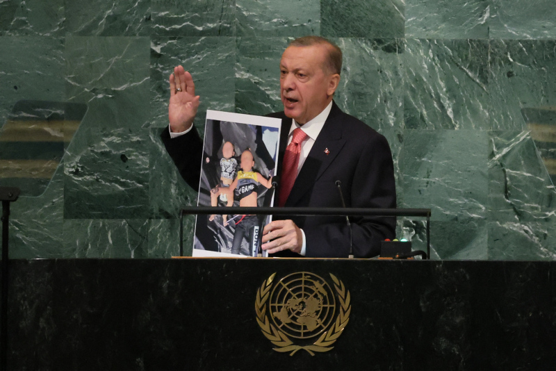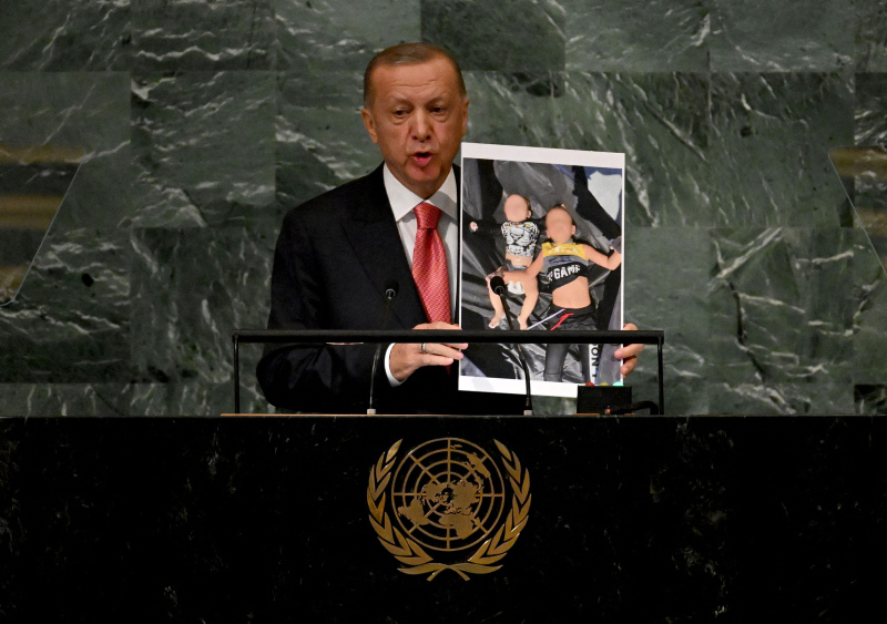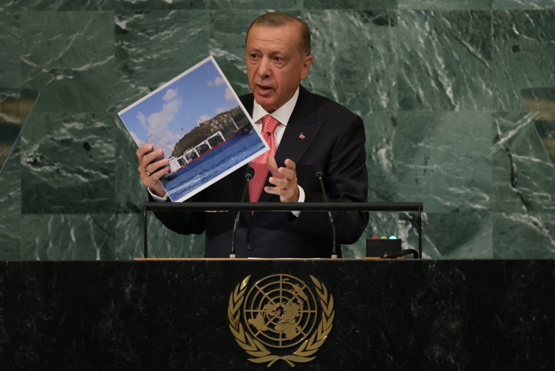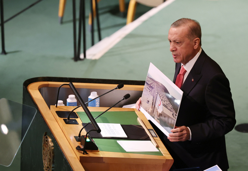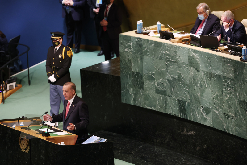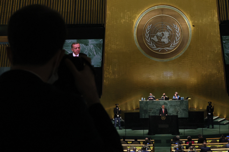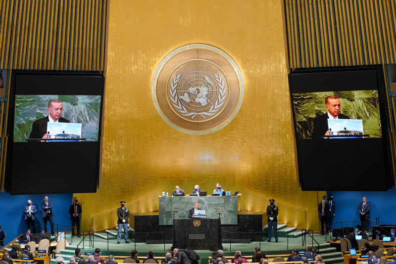 Başkan Recep Tayyip Erdoğan BM Genel Kurulu'nda dünyaya seslendi. Konuşmasına ekonomi ile başlayan Başkan Erdoğan enflasyon baskısının dünya çapında etkilerinin olduğununun altını çizdi. Diğer yandan Başkan Erdoğan Rusya Ukrayna savaşının diplomatik bir yolla çözülmesi gerektiğini vurguladı. Yunanistan'ın Ege'deki provokatif tavrına da değinen Başkan Erdoğan "Yunanistan hukuksuz, pervasız geri itmeleriyle Ege'yi mülteci mezarlığına çevirmektedir" ifadelerini kullandı. İşte detaylar....