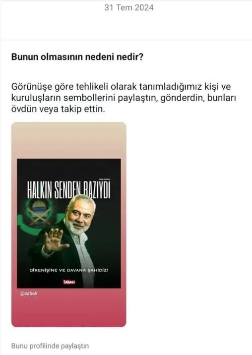 Mark Zuckerberg'in sahibi olduğu Meta platformu (Instagram-Facebook) Hamas lideri İsmail Haniye'nin şehit edilmesinin ardından yapılan paylaşımları bilinçli olarak engellemişti. Instagram, 'tehlikeli' olarak nitelediği Haniye hakkındaki içerikleri tek tek sansürlemişti. Instagram'ın politikası sosyal medyada büyük tepki çekmişti.