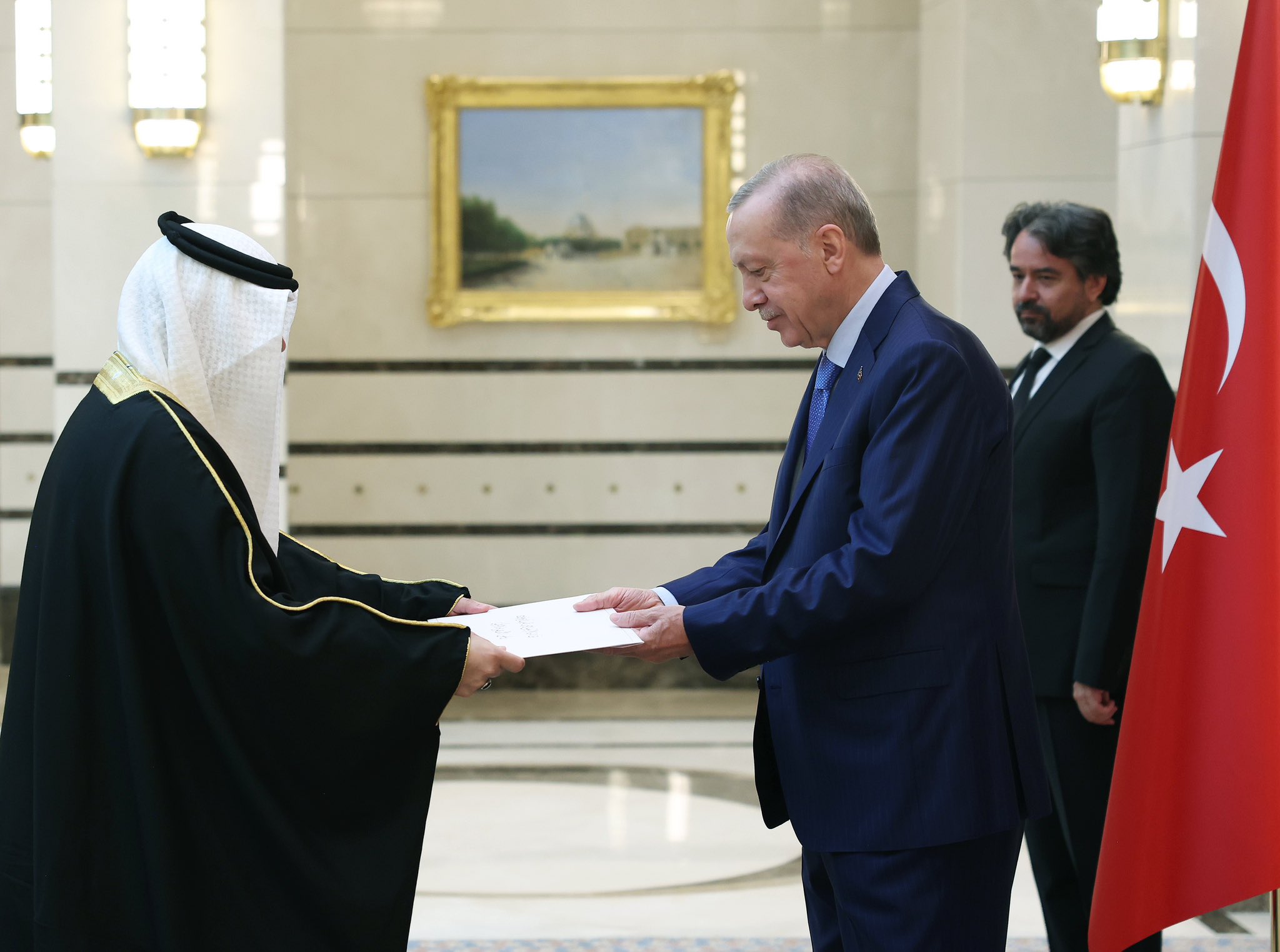 Başkan Recep Tayyip Erdoğan, Bahreyn Büyükelçisi Bassam Ahmed Marzooq'u Cumhurbaşkanlığı Külliyesi'nde kabul etti.